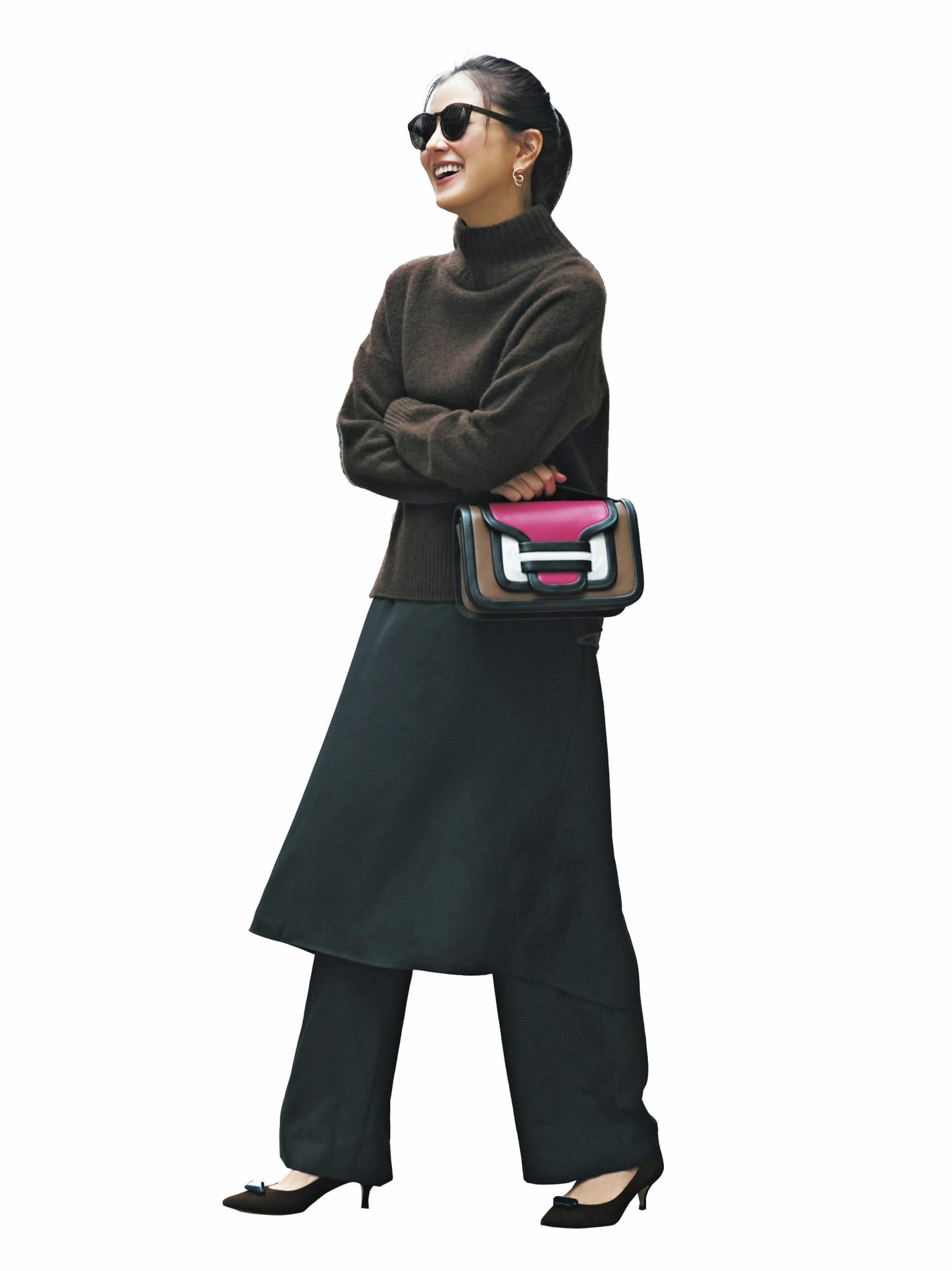 堅く見えがちな黒パンツもスカートのおかげで動きが生まれ、軽やかな着こなしに。新顔のロング丈は、最先端なおしゃれを楽しめるのもポイント。着飾りすぎない適度な華やかさが都会レディを作ります。