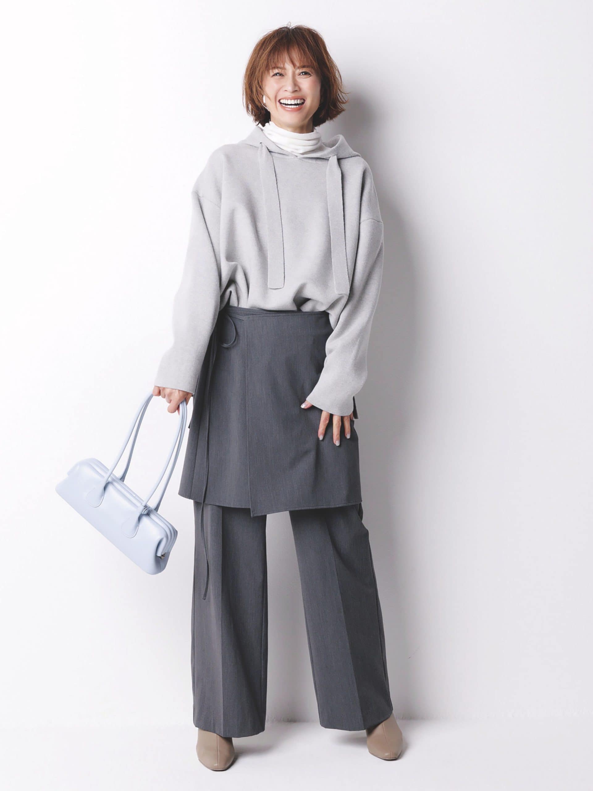 スカートパンツ¥27,500(ミースロエ/MIESROHE ルミネ新宿1店)ニットフーディ¥35,200(プルミエ アロンディスモン/プルミエ アロンディスモン NEWoMan新宿)中に着たカットソー¥9,900(マルゥ ユナイテッドアローズ/ユナイテッドアローズ カスタマーサービスデスク)バッグ¥44,000(オソイ フォー ユナイテッドアローズ/OSOI SHINJUKU)ブーツ¥15,950(ル タロン/ル タロン 有楽町マルイ店)ピアス¥12,100(IRIS 47/フーブス)