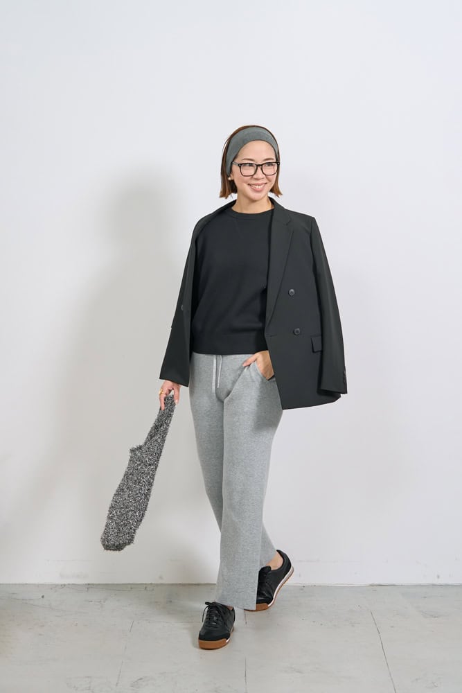 全体を引き締めてクールに見える黒ジャケットは、どんなスタイルにも馴染む万能アイテム。カジュアルなニットパンツとの相性もよく、抜け感が出てモード感が増します。トップスは、スウェット見えしますが、ニットなのでカジュアルダウンし過ぎず、黒でまとめることで全体的に統一感が生まれ、キレイめカジュアルに。