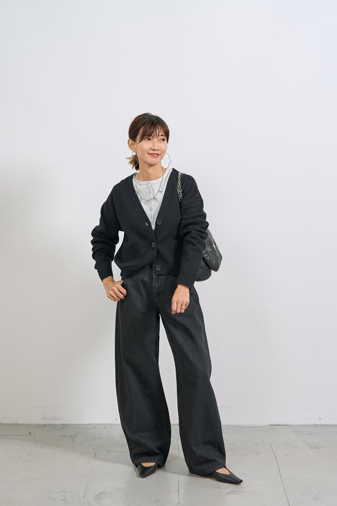 VネックカーデとネックTのレイヤーで今っぽ”ほぼクロ”ファッションに