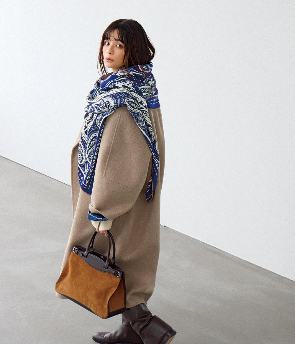 カレジェアン カシミアシルク「シュヴァル・ドゥ・クール・バンダナ」¥234,300バッグ¥1,980,000ブーツ¥475,200(すべてエルメス/エルメスジャポン)コート¥86,900(コンテ/コンテ青山店)デニムジャケット¥35,200(ウェストオーバーオールズ/RHC ロンハーマン)シャツ¥71,500(コモン スウェーデン/ウィムガゼット 玉川髙島屋S・C店)