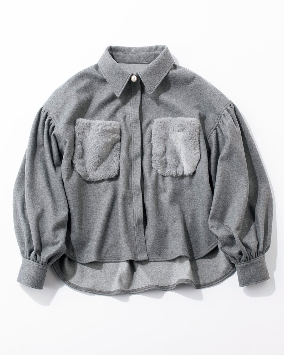 ファーにパールと可愛いが凝縮された中間アウター。厚手のフラノ素材を使用したアウターにもなるブラウスです。大粒のパール、リュクス感あるエコファーのポケットとディテールが凝っているので、これ1枚でおしゃれ見えが叶います。袖のあしらい方でも印象変化が楽しめ、ヒップもカバーする前後差付きです。