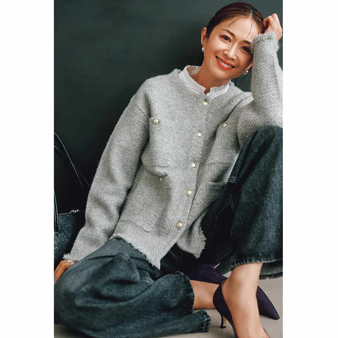 ①羽織るだけでサマ見えを叶える「ツイード見えニットジャケット」