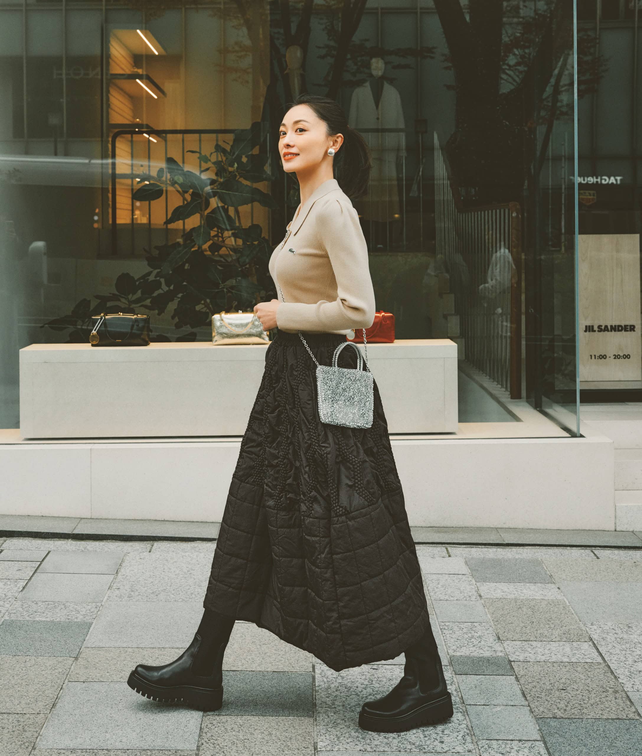 ふんわりとしたボリュームが魅力のキルティングスカートには、足元に重さのあるブーツを合わせてバランス調整を。ごつめブーツで重心を下げることで、甘さを大人仕様に引き締めます。スタイルアップが叶うのも嬉しいポイント。