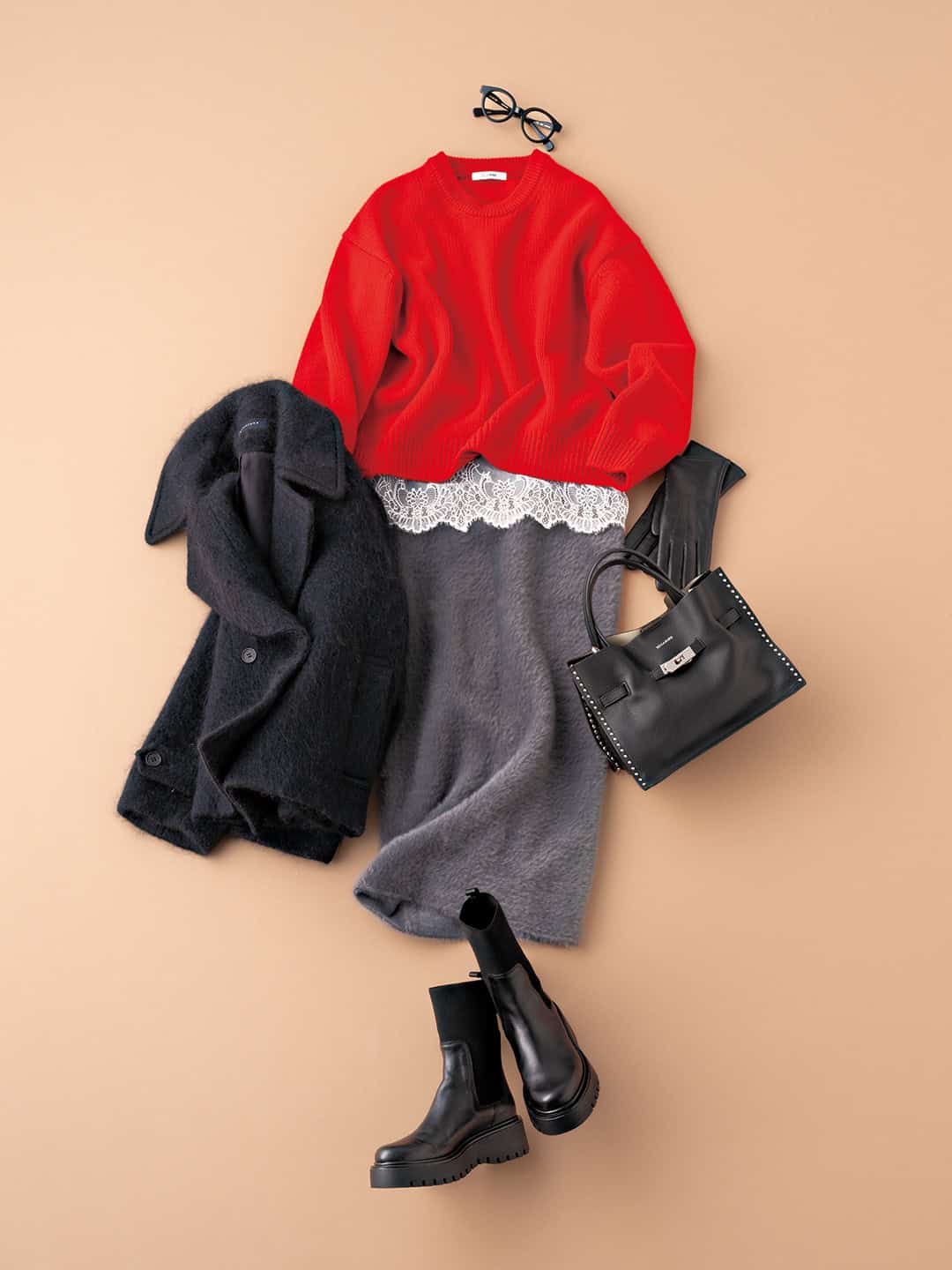 マゼンタニットカーディガン¥28,600ニット¥23,100(ともにルル・ウィルビー/アルアバイル)スカート¥42,900(DES PRÉS/DES PRÉS)オレンジバッグ¥88,000(ボナベンチュラ)7ペンダントトップ¥111,100ネックレスチェーン¥375,100(ともにNo./ナンバードット)パンプス¥19,800(ル タロン グリーズ/ル タロン グリーズ ルミネ新宿店)オレンジリング¥176,000パールリング¥178,200(ともにマリハ)タイツ/スタイリスト私物