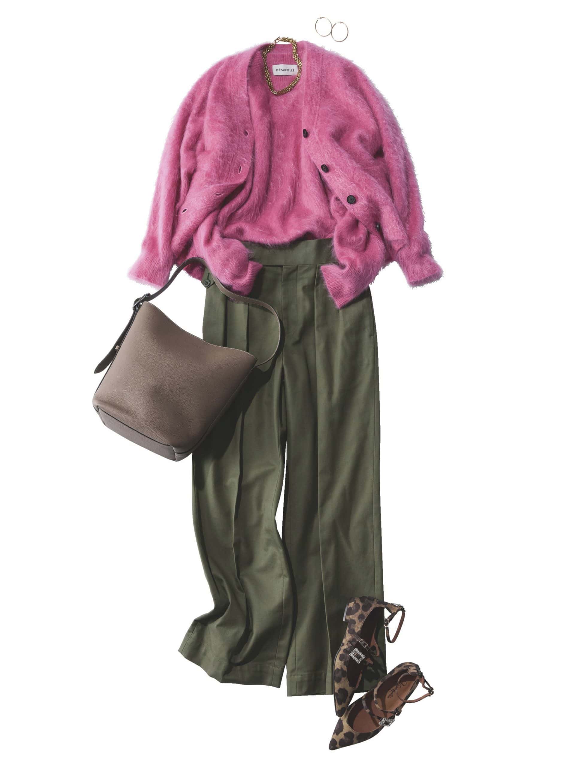 ニット¥88,000カーディガン¥99,000(ともにデパリエ/デパリエ 伊勢丹新宿店)パンツ¥30,800(タンジェント/ザ エディット ストア)バッグ¥238,700(ボナベンチュラ)パンプス¥24,200(銀座かねまつ/銀座かねまつ6丁目本店)ピアス各¥198,000(マユオカマツ/マユ ショールーム)ネックレス¥25,300(メラキ/オブリオ)