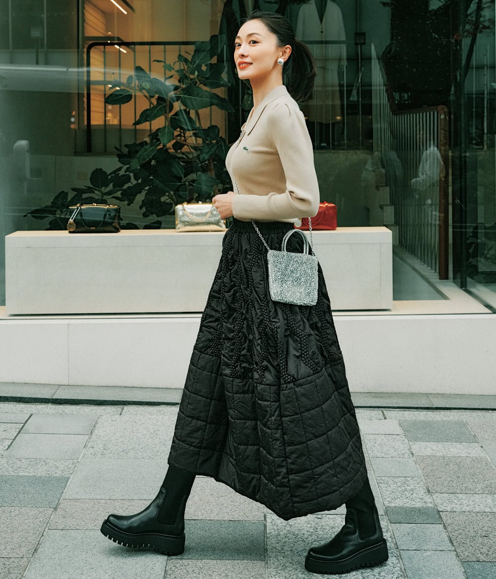 切り替えの上下でデザインの異なる“ひとクセ”キルティングスカートを主役にコーデ。ワンツーでもしっかり華やげるうえ、ストレスフリーなウエストゴム、自宅で洗えるイージーケアと実用性も優秀!ベージュのポロニットで品よくヘルシーに仕上げてショッピングへ。