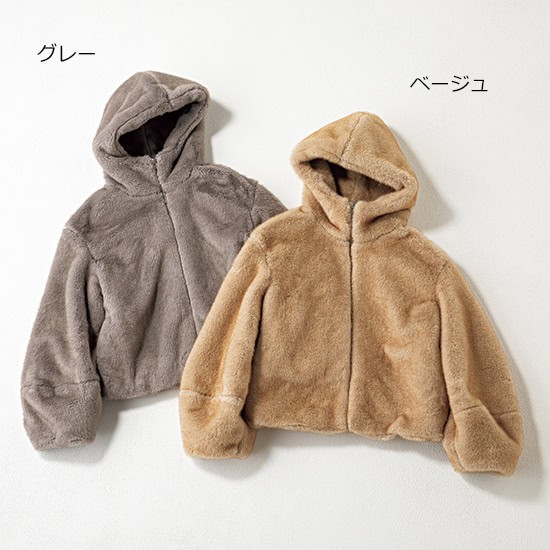 袖先に向かってポワンと広がるスリーブデザインが、カジュアルなフードブルゾンにさりげなく大人の可愛さをONします。優しい色合いのエコファーを採用し、上品で高見えします。大人にさじ加減のいいショートレングスでワイドパンツやボリュームスカートといった旬ボトムスと好相性です。