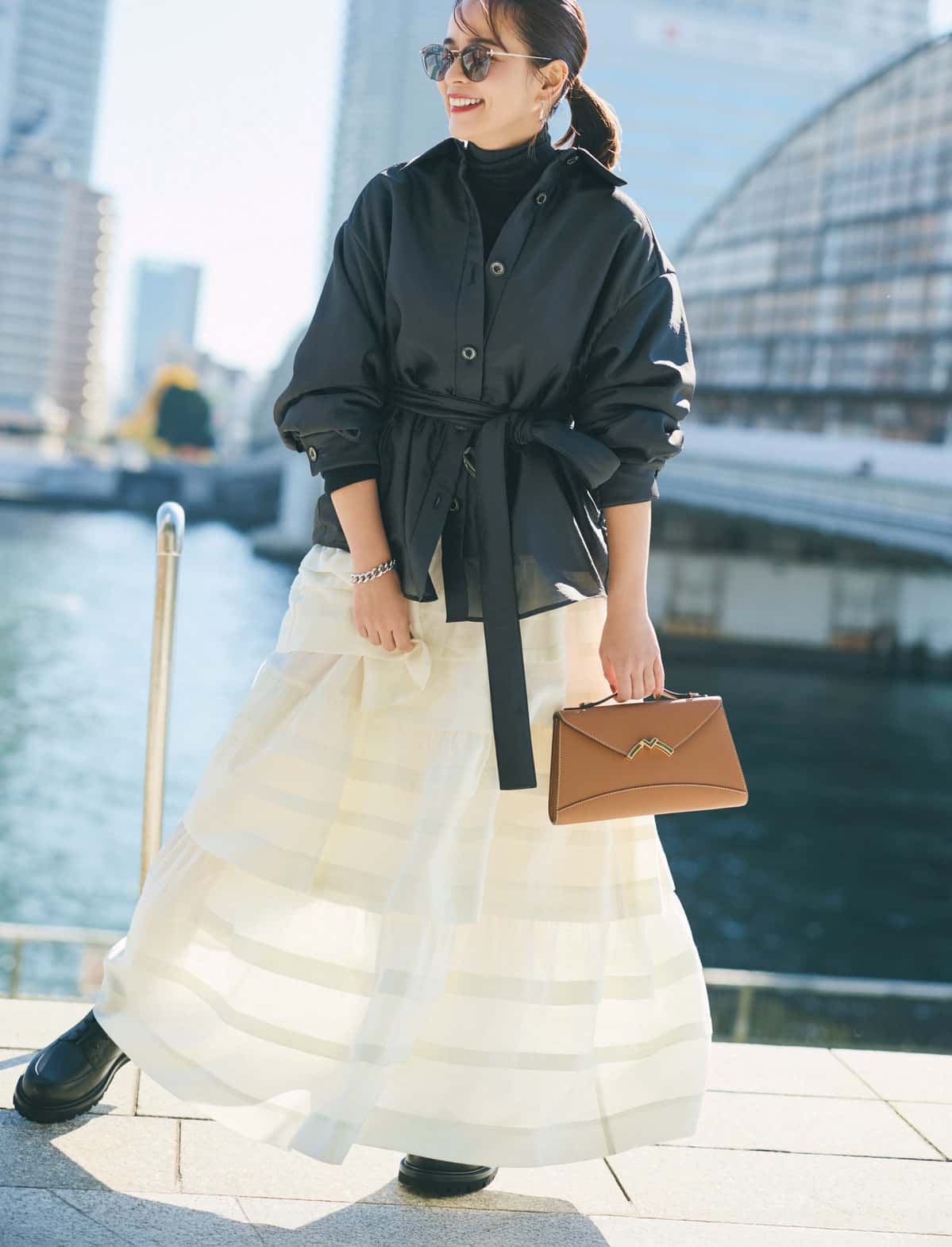 マニッシュなシャツジャケット×甘ティアードスカート。立体感のある華やぎで、柄スカート感覚で着られるティアード。ボリュームがある分、ウエストマークのシャツジャケットでキリッと感をON。