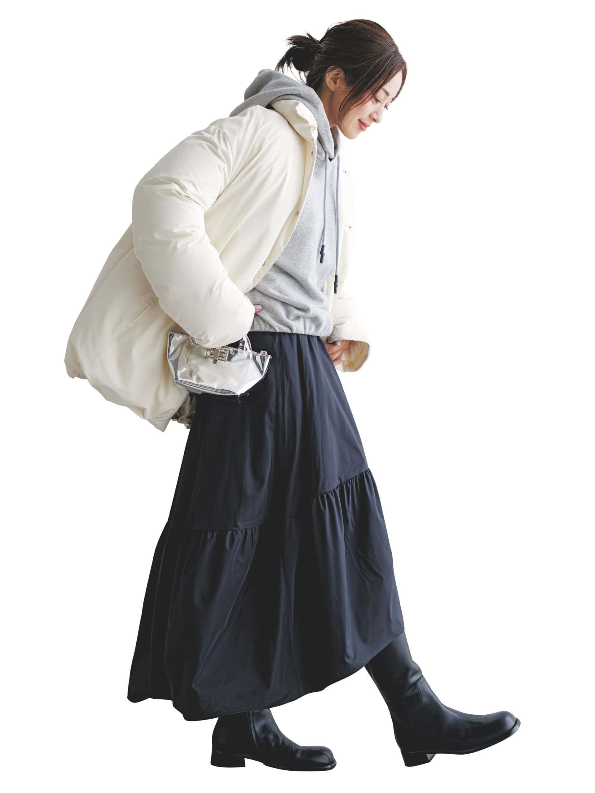 カジュアル感強めなフーディも、ぽわんとしたシルエットが可愛いスカートに任せれば脱・部屋着感。モードな黒ブーツや白のアウターを重ねて、キレイめ印象を後押しして。