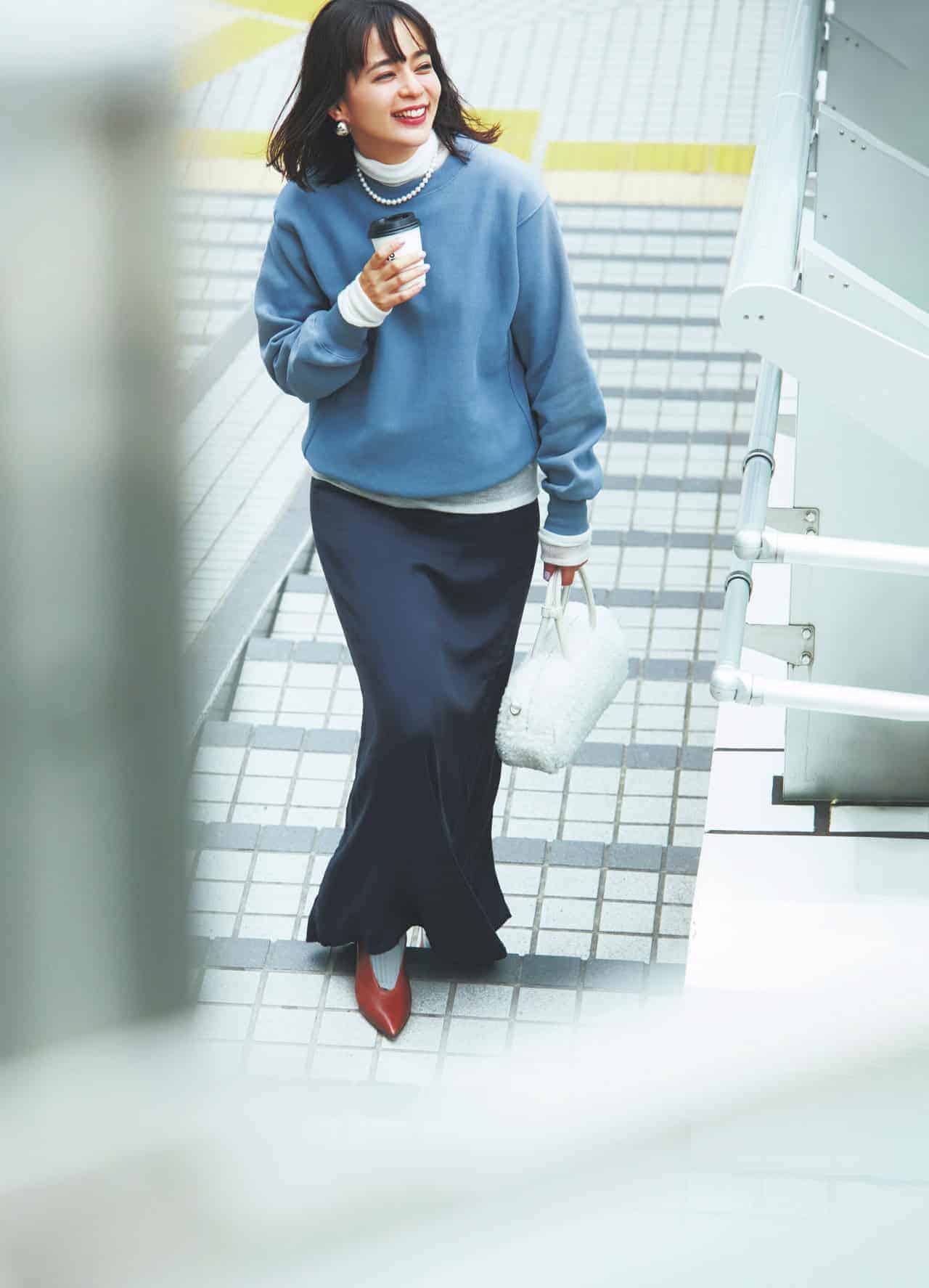 予定が多く忙しい40代は、「ラクチン」前提のオシャレをしたい日も多いはず。そんな理想を叶えてくれるのが、“きれいめスウェット×スカート”のコーデ。スウェットで動きやすさを担保しつつ、女性らしいシルエットやデザインのスカートで華やぎのバランスを取るのがポイントです!
