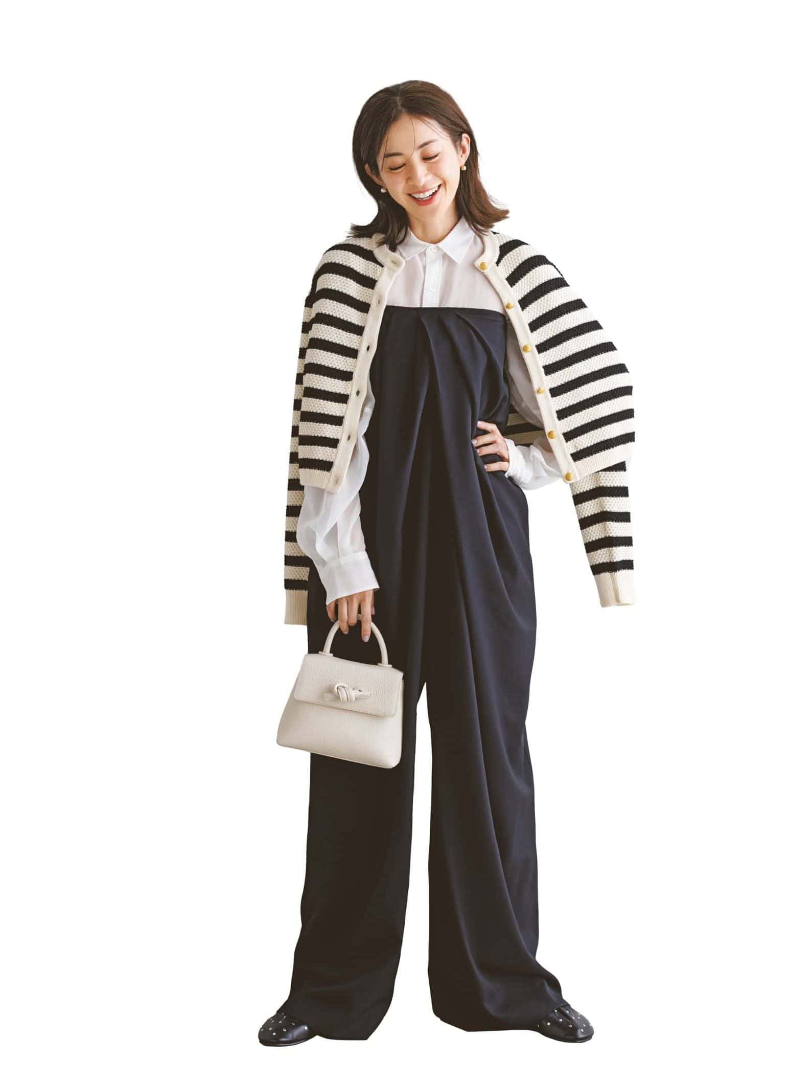 ドレープの効いたオールインワンに白シャツを合わせてクリーンに。シアー素材がデコルテに抜けをつくり、女性らしさをさりげなくプラス。ニットのボーダーカーデを重ねれば、ナチュラルで華のあるモノトーンが完成。