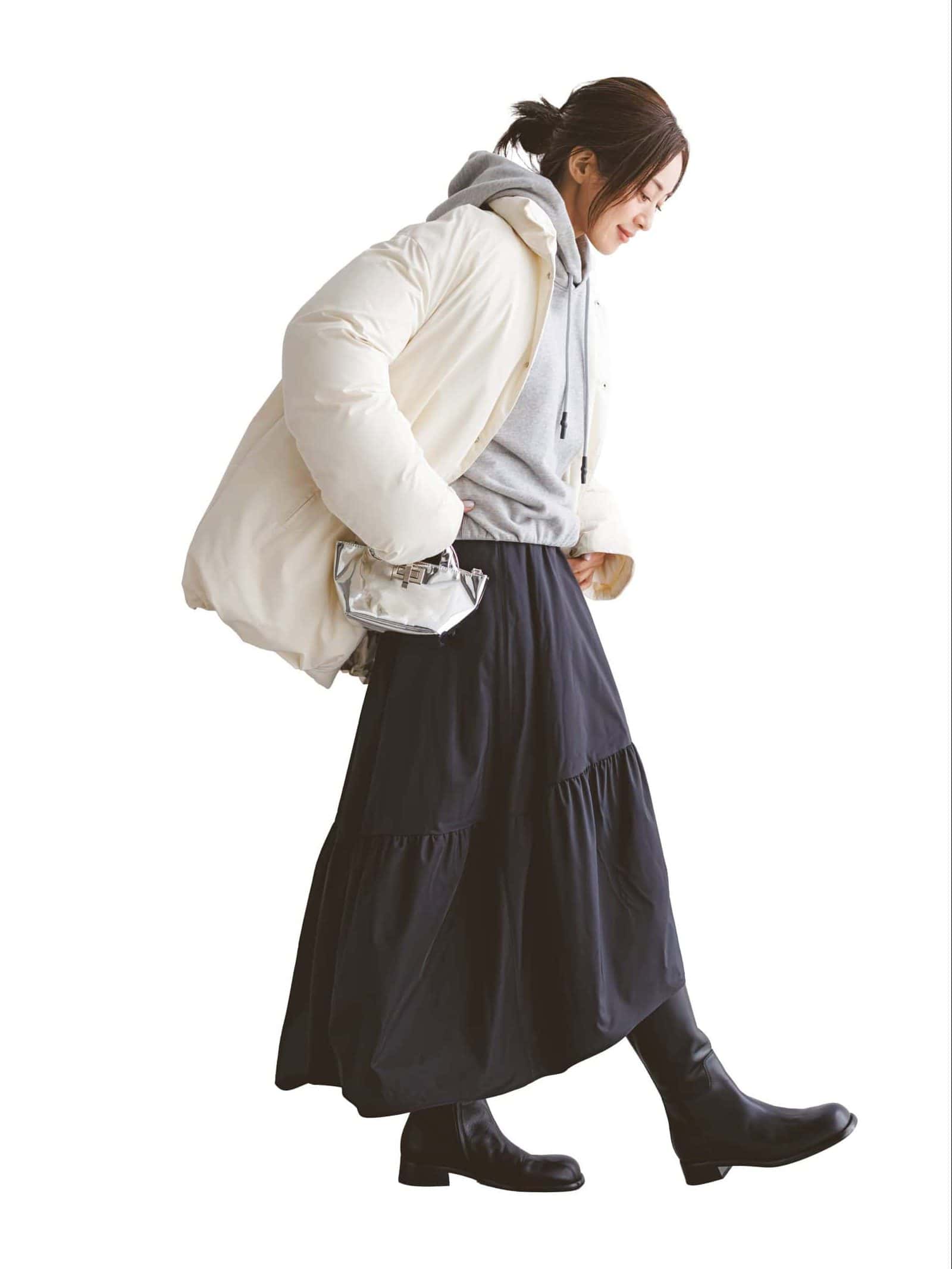 スカート(ブリル/ブリル新宿)ダウンコート¥99,000(ロエフ/エイチ ビューティー&ユース)パーカ¥33,990(アストラット/アストラット 新宿店)バッグ¥9,900(HELO{hlb}YSE/ジャック・オブ・オール・トレーズ)ブーツ¥221,100(セルジオ ロッシ/セルジオ ロッシ ジャパン カスタマーサービス)