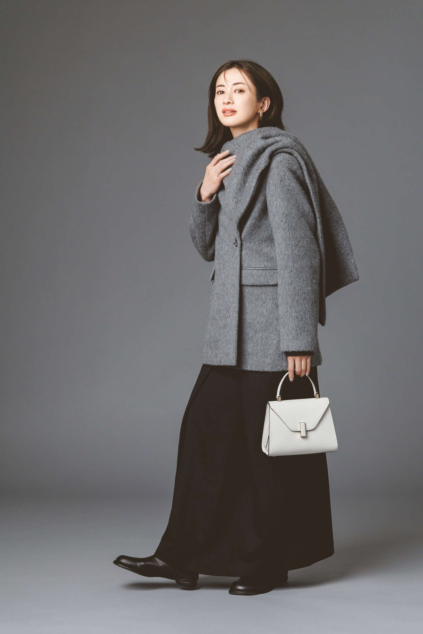 黒のロングワンピにグレーコートを重ね、コントラストをやわらかく調整。モノトーンにグラデーションを効かせることで、シックさを保ちつつ女性らしさを引き立てます。目を引く白のミニバッグを添えれば、全体がぐっと洗練された印象に。