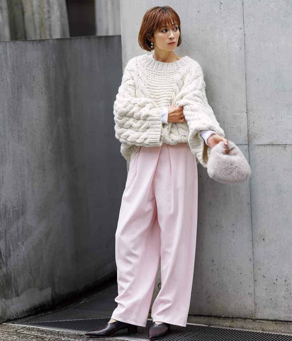 ワイドパンツの中でも、最旬なのがバレルシルエット。立体感のあるフォルムが全身ホワイトを洗練された印象に。ベルトが映えるハイウエストが、ニットスタイルをきりっと引き締めます。小物で黒を効かせればメリハリが生まれ、冬のマンネリ打破にも最適。