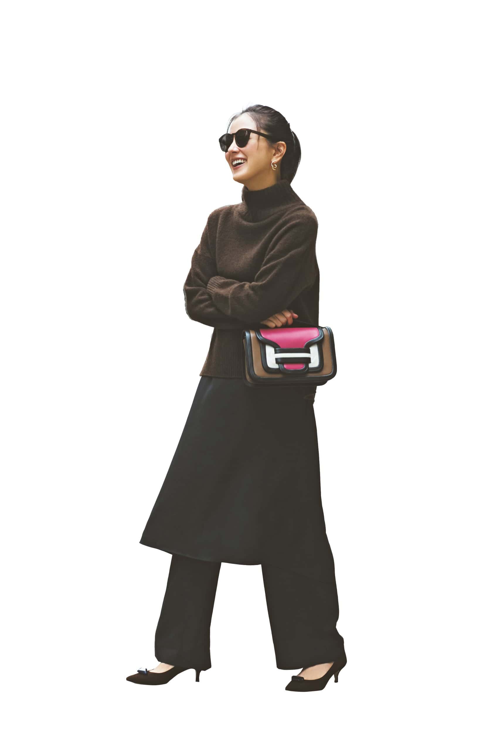 ニット¥39,600(ティッカ)パンツ¥22,000(MIESROHE/MIESROHE ルミネ新宿1店)バッグ¥187,000(ピエール アルディ/ピエール アルディ 東京)パンプス¥73,700(ネブローニ)サングラス¥28,600(ロンハーマン)ピアス¥39,600(ブランイリス/ブランイリス トーキョー)