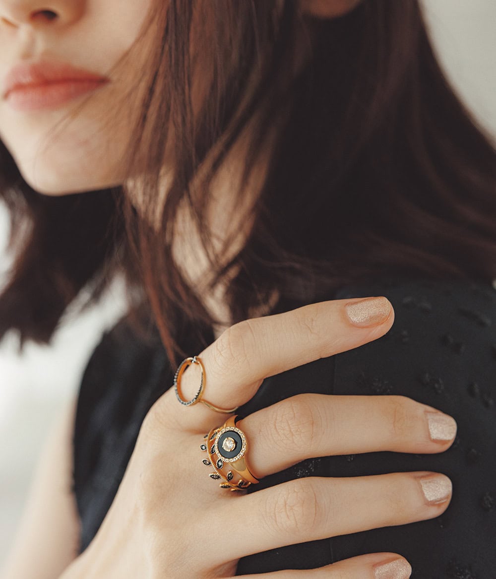 中指上〈YG×ブラックカルセドニー×D×ブラウンD〉¥374,000(ヴァンドーム青山/ヴァンドーム青山 プルミエール 伊勢丹新宿店)人差し指〈SV×YG・ブラックロジウムコーティング×D〉¥19,800中指下〈SV×YG・ブラックロジウムコーティング×D〉¥29,700(ともにARTIDA OUD)プルオーバー¥15,400(ドレステリア/ドレステリア 渋谷スクランブルスクエア店)