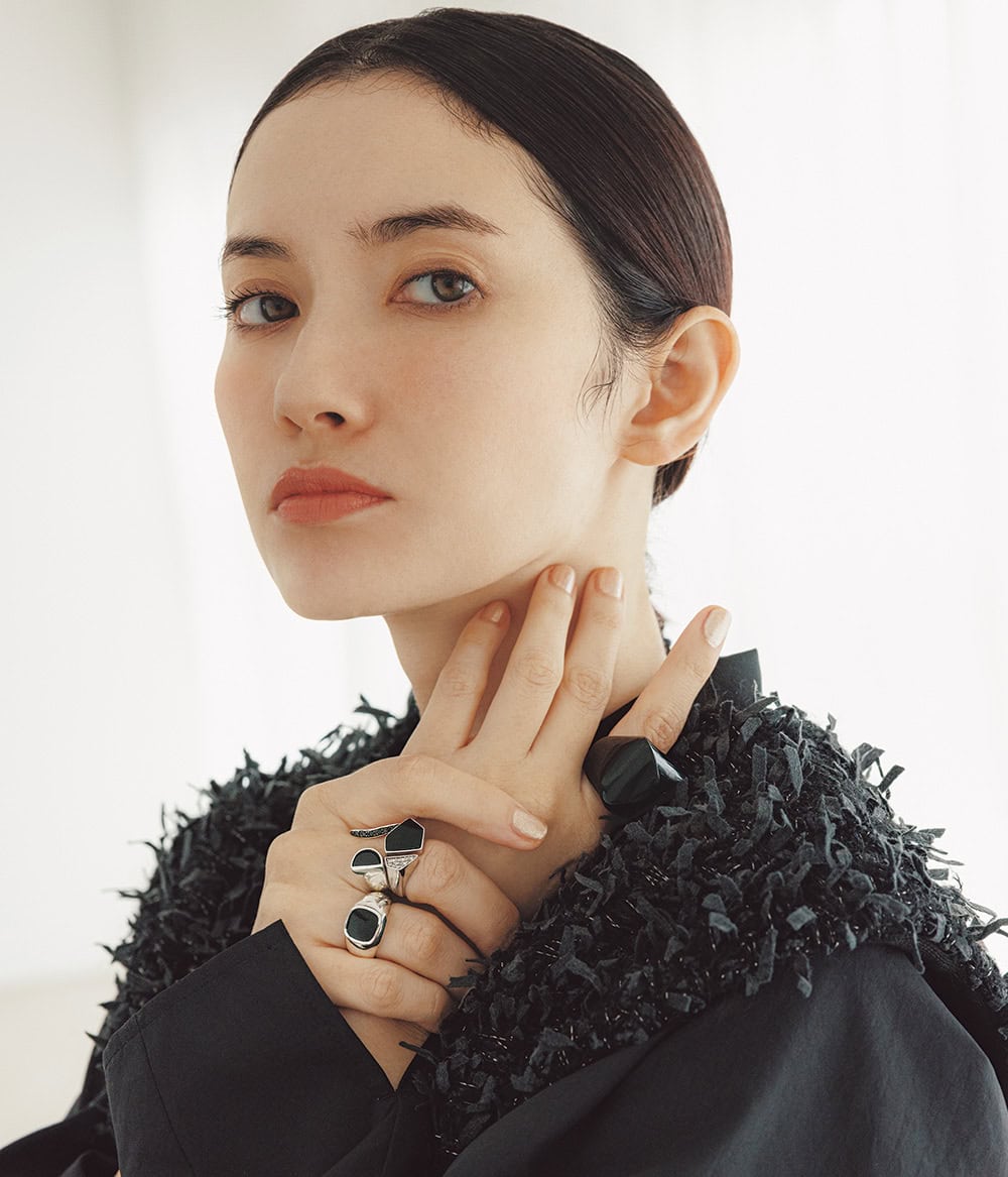 リング右手薬指〈SV×オニキス〉¥42,000(LORO)中指指先から〈SV×オニキス×D〉¥78,100(プライマル)〈SV×ブラックカルセドニー×CZ〉¥46,200(ヴァーミリオン)左手〈オニキス〉¥145,200(ソフィー ブハイ/エスケーパーズ アナザーワールド)プルオーバー¥19,800(カデュネ/カデュネ プレスルーム)シャツ¥42,900(フミエタナカ/ドール)