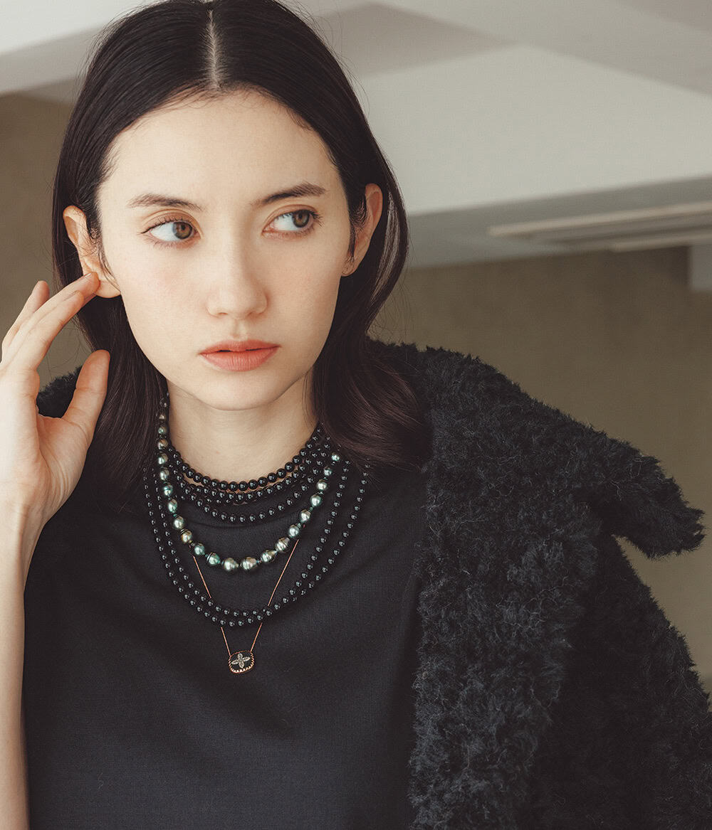 多連にしたロングネックレス〈オニキス〉¥163,900〈ソフィー ブハイ〉パールネックレス〈SV×タヒチアンパール〉¥242,000〈マリコ ツチヤマ〉(ともにエスケーパーズ アナザーワールド)チェーンネックレス〈PG×SV×D×レジン〉¥155,100(パスカル モンヴォワザン/ショールーム セッション)ジャケット¥53,900(ジャッキー/ジャック・オブ・オール・トレーズ プレスルーム)カットソー¥15,400(オブリオ)