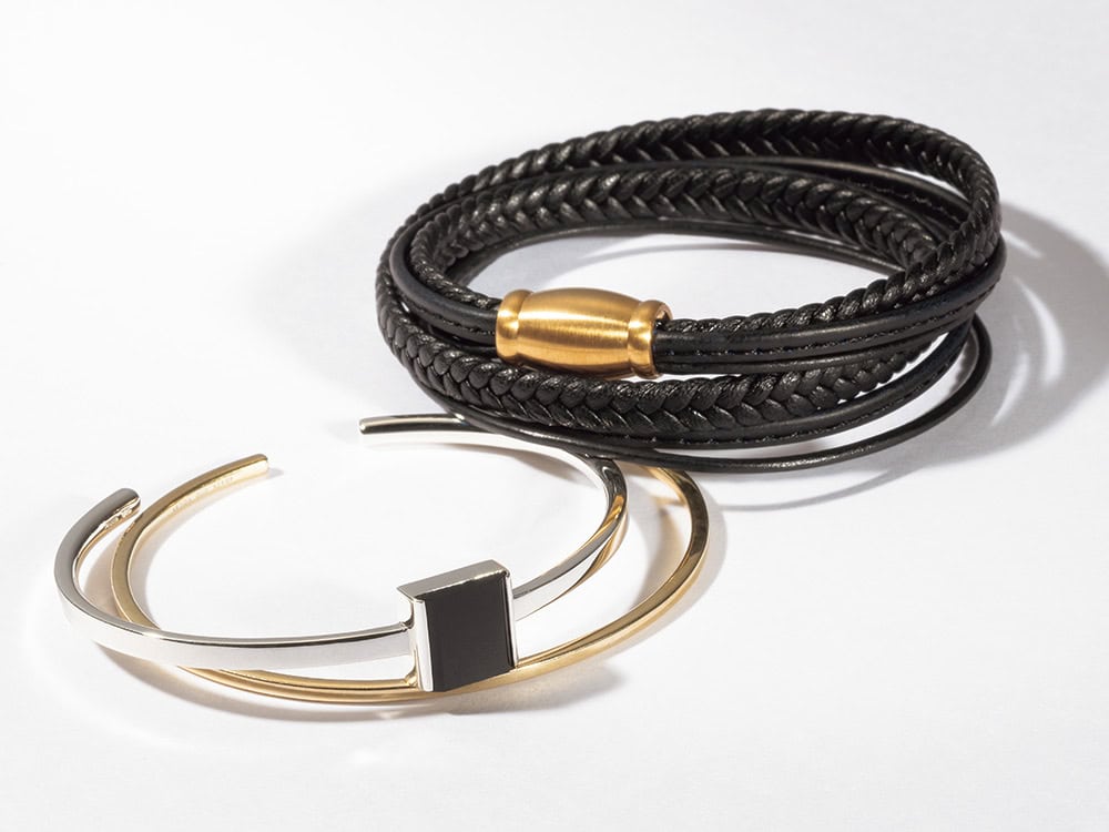 黒石とレザー、金具とバングルのゴールド、繋がりを持たせるのが鍵。