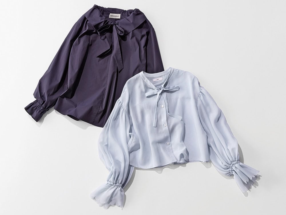 細タイブラウス(ネイビー)¥29,700(デパリエ/デパリエ 伊勢丹新宿店)細タイブラウス(サックス)¥27,500(yori)
