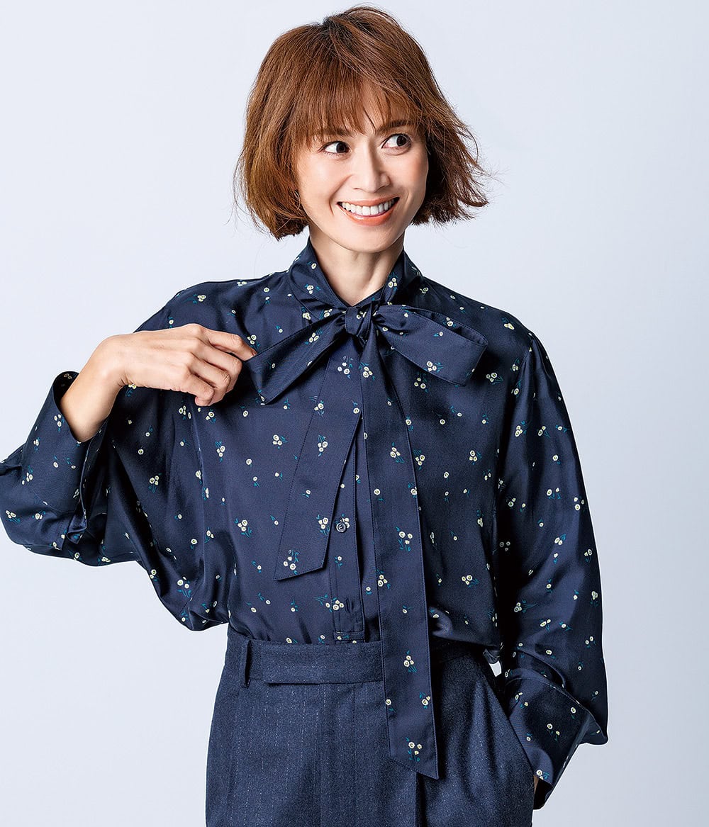 ・小花柄の細タイブラウスが程よい抜け感もあって私的には特にコーデによく使いました。小さな柄で新鮮に感じます。(スタイリスト・竹村はま子さん)