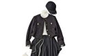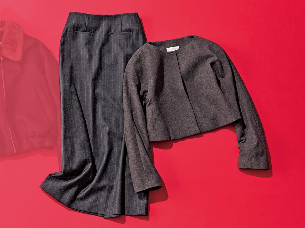 〈右から〉肩のラインをなぞるようにカーブを描く洗練フォルム。ジャケット¥56,100バックスリットの入ったウールマキシスカート。スカート¥34,100(ともにアモーメント)