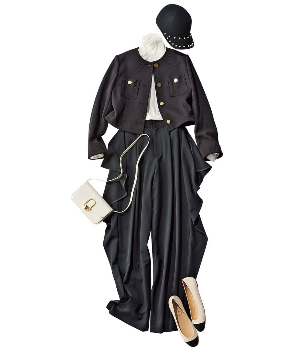 ・今季もたくさん黒パンをリースしましたが、このサイドフリルが印象的。甘辛のさじ加減も絶妙でコンサバのハズしに投入したい。(スタイリスト・石毛のりえさん)