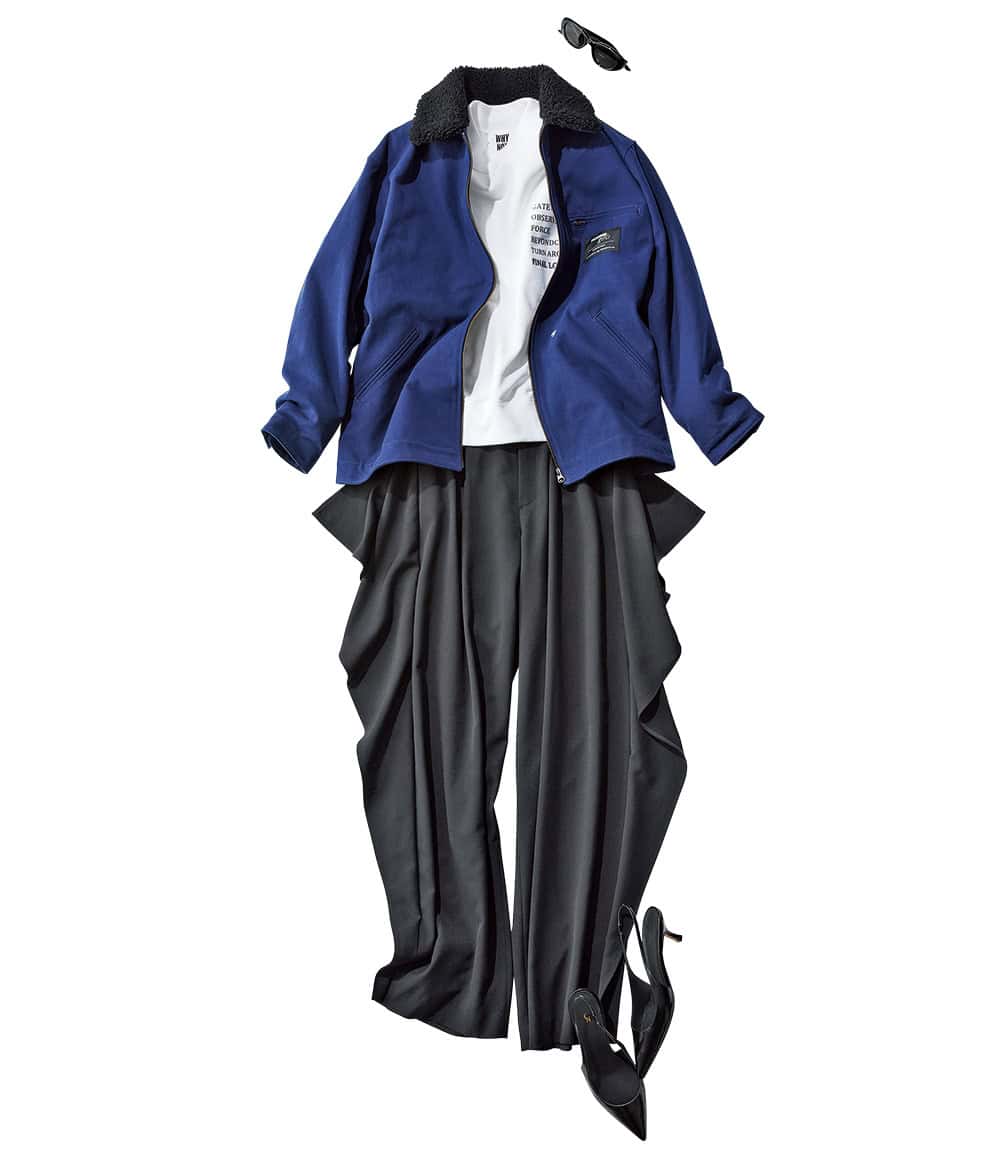 ・メンズライクなカバーオールブルゾン×サイドフリルパンツで強さの中に女っぽさをひと盛り。この真逆のテイストMIXが今っぽさの秘訣。(スタイリスト・石関靖子さん)