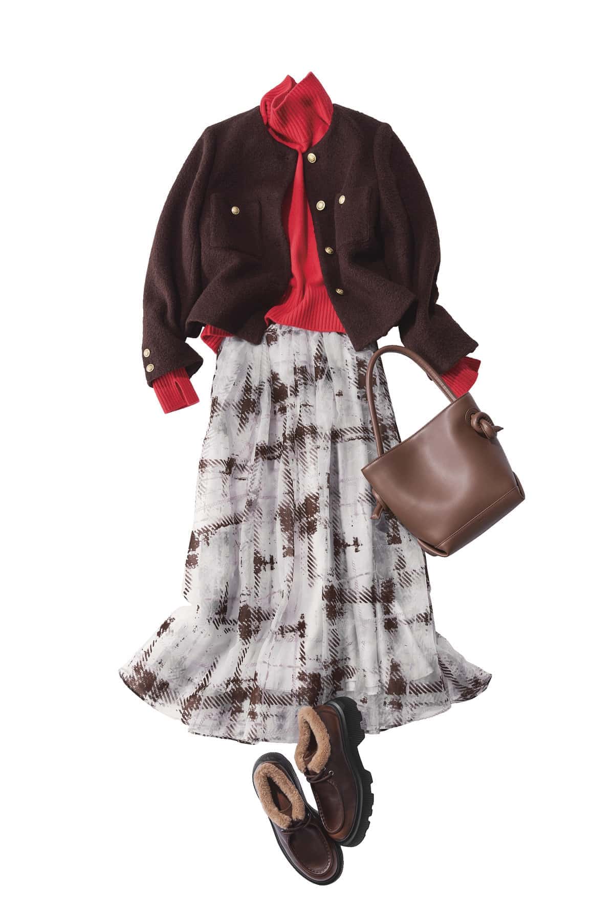 最愛の組み合わせである「ノーカラージャケット×タートルニットは、赤をのぞかせることで、ぐっと今っぽさが出ます。同系色にブラウンのワントーンコーデだから鮮やかな赤でも悪目立ちせず、ナチュラルに馴染みます。