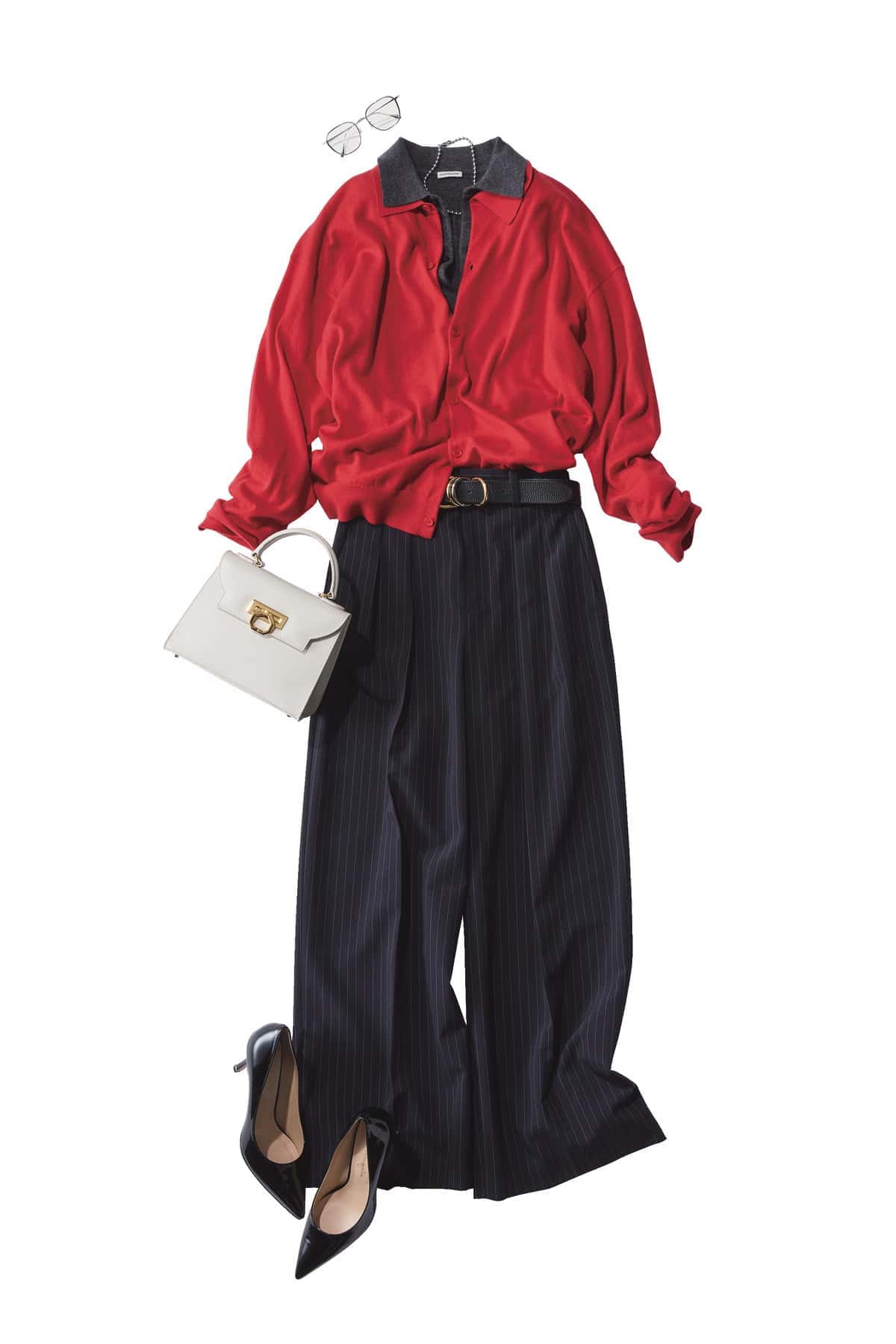 赤とグレー、2枚の衿をレイヤードする上級コーデ。ストライプのワイドパンツで、縦ラインを強調しつつ視線を上に集めるので、スタイルアップ効果も期待できそう!