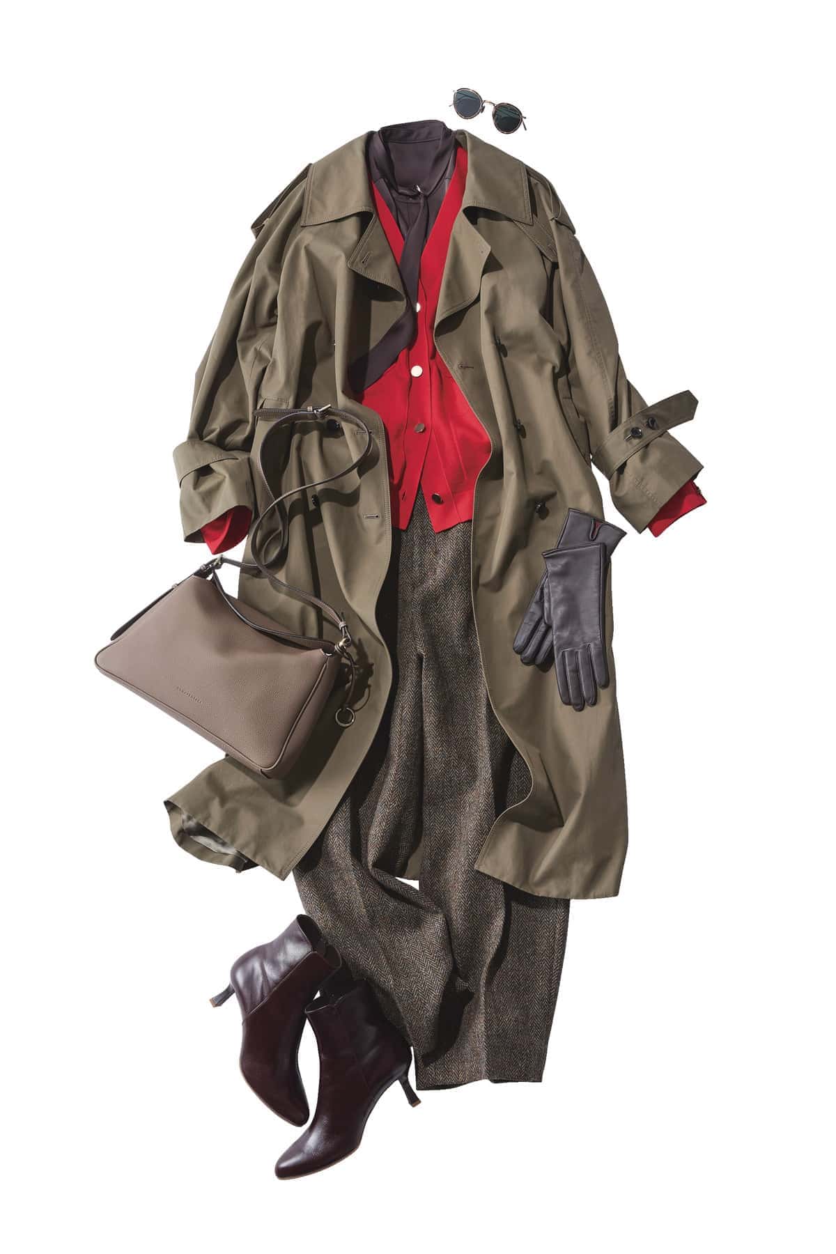 アクセントの赤ニットをレイヤードしつつ、似たトーンの色を重ねることでコーデに奥行きが出て説得力UP。構築的な重ね着で洗練されたこなれ感を。