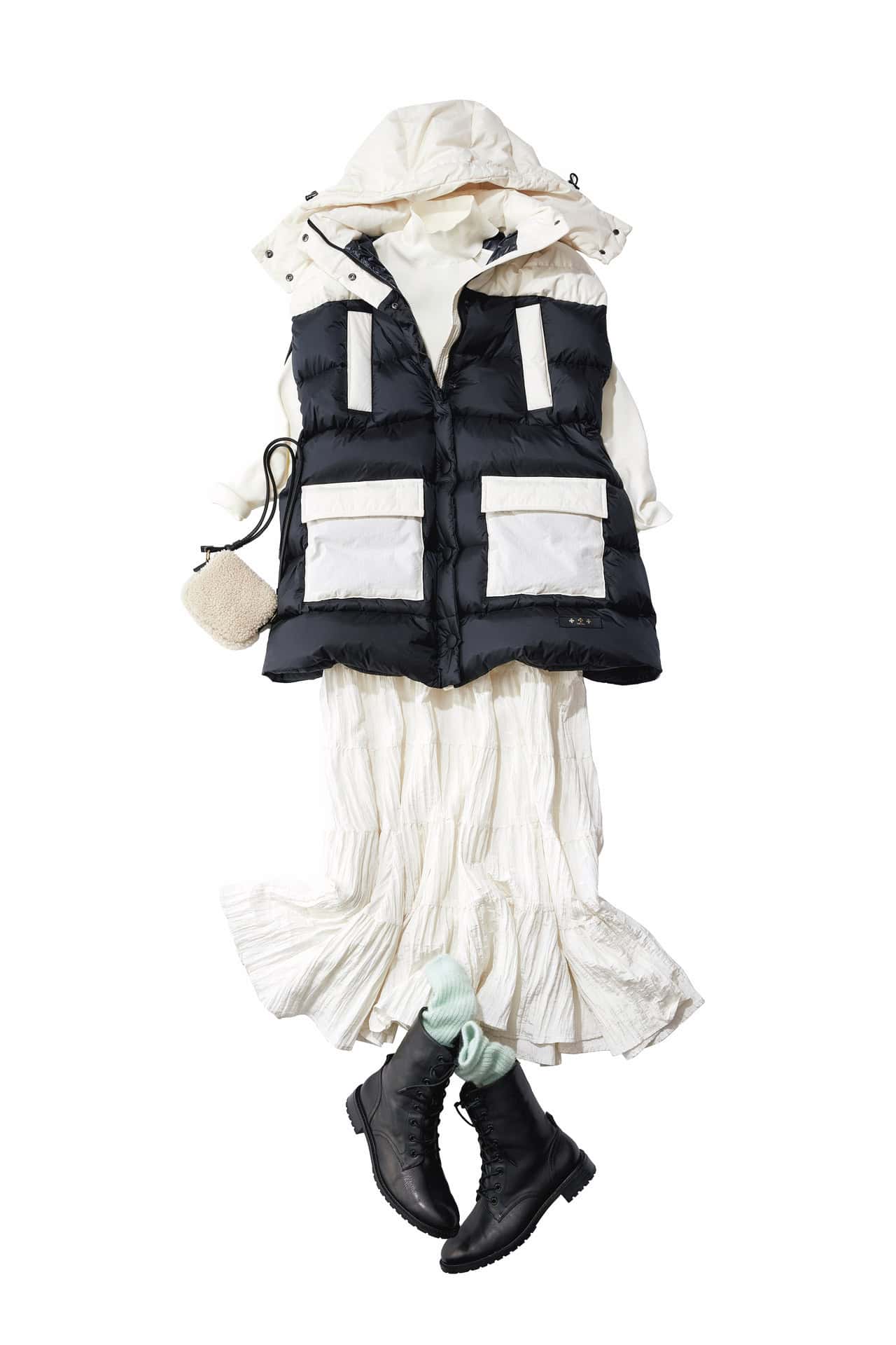 今季注目のポンチョ型ダウンは、羽織るだけで絵になる存在感。白×黒のコントラストが、冬の装いをシャープに引き締め、重見えを防ぎます。白スカートを合わせれば、動きと華やぎが加わりエレガントに。防寒しながら感度の高さもアピールできる、主役級ダウンです。