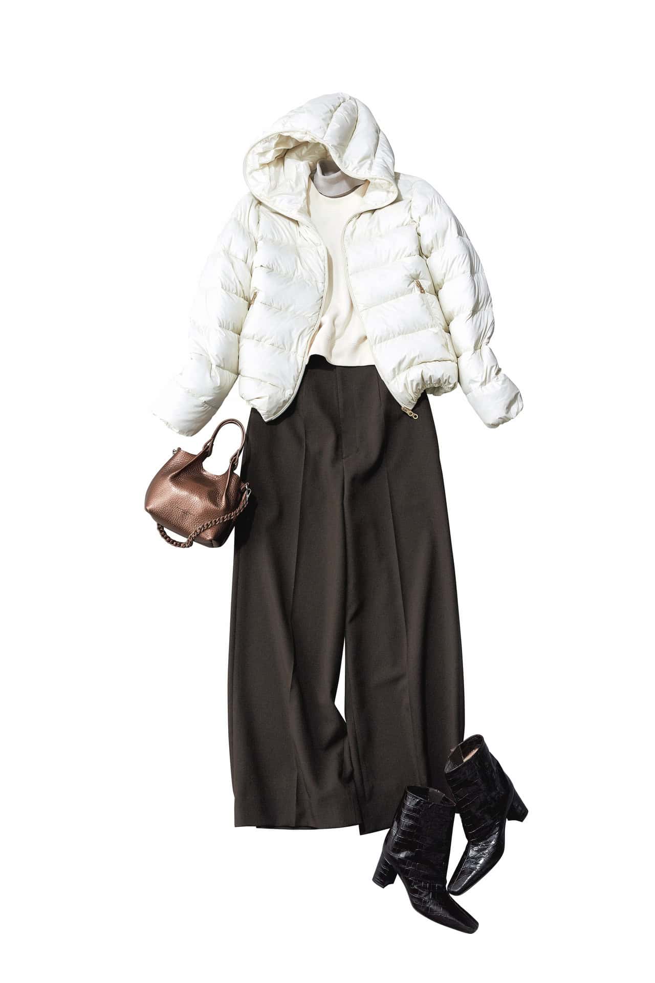 着回し力抜群の白ダウンは、きちんと感を意識したい日にも頼れる存在。トレンドのブラウンパンツを合わせることで、親しみやすさと今っぽさをプラスします。ヒールブーツで足元を引き締めれば、全体がすっきり洗練された印象に。軽やかさと女性らしさが共存する、好感度コーデです。