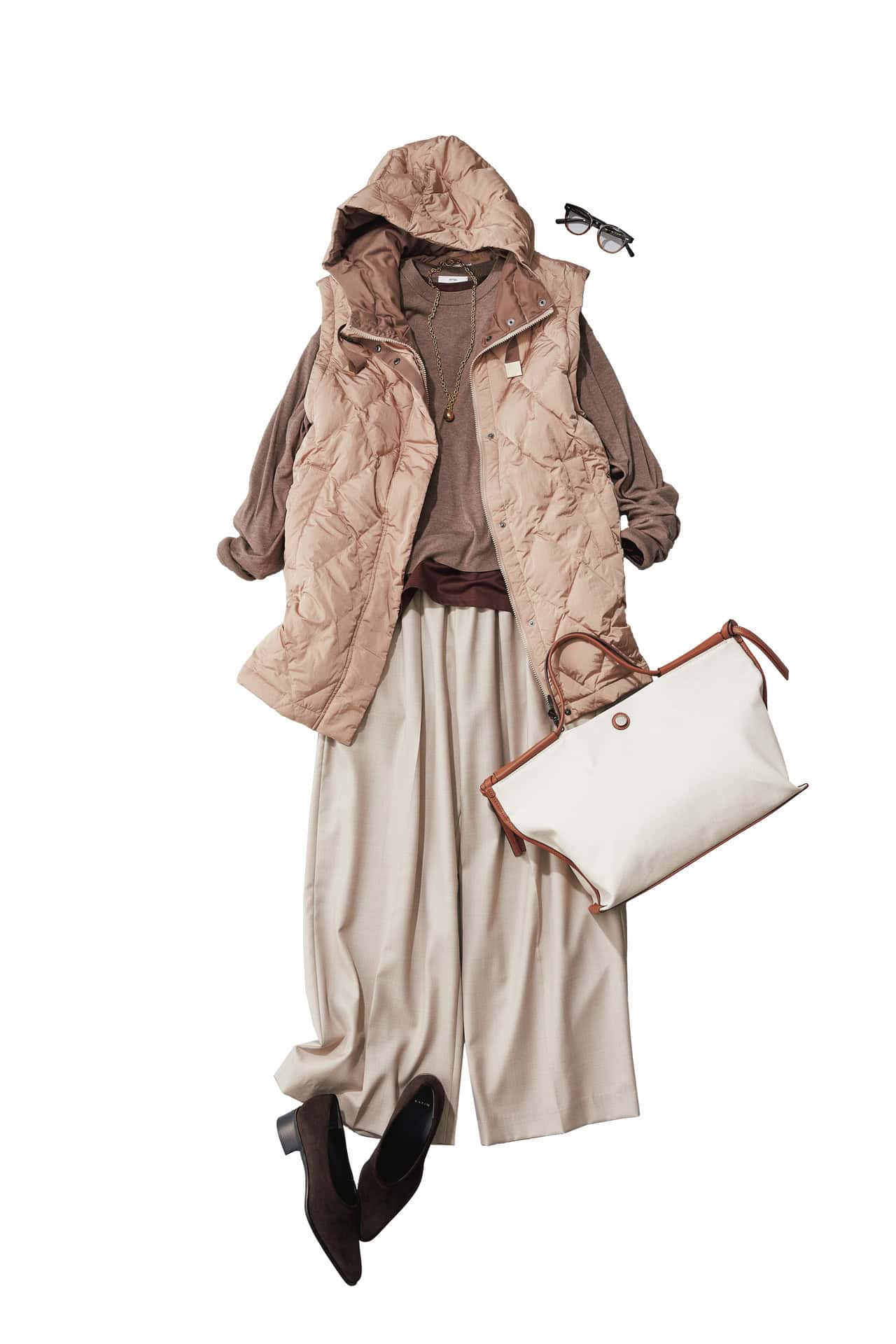2WAYダウンジャケット¥59,400(YOSOOU/ジョワイユ)ニット¥49,500(エイトン/エイトン青山)ロングスリーブカットソー¥28,600(タトラス/タトラス 銀座店)ワイドパンツ¥49,500(POSTELEGANT/ポステレガント)バッグ¥27,500(サムウェア ストゥディオ/エリオポール代官山)パンプス¥63,800(カチム)メガネ¥46,200(アイヴァン/アイヴァン 東京ギャラリー)ネックレス¥21,780(チビ・ジュエルズ/ZUTTOHOLIC)