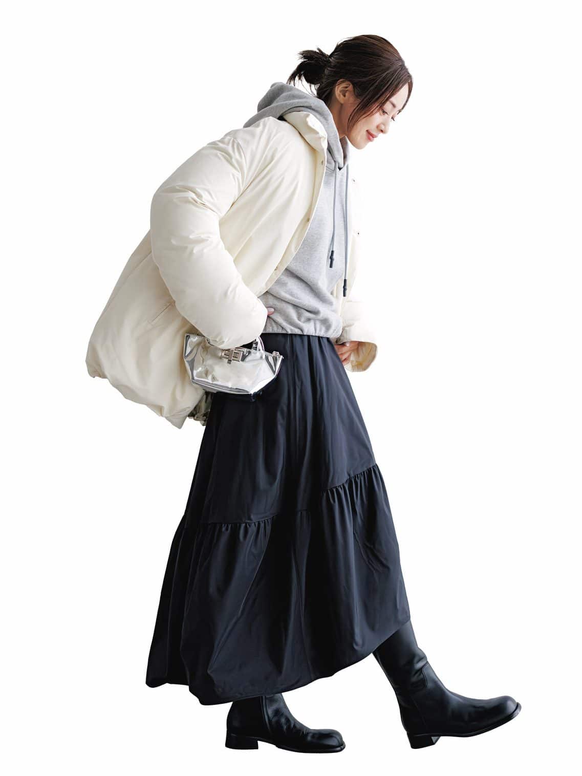 白ダウンの軽やかさに、グレーと黒を効かせた洗練モノトーンコーデ。ボリュームのあるダウンも、白を選ぶことで重さを回避し、顔映りまで明るく見えます。アシンメトリーの黒スカートが動きを生み、カジュアルなパーカー合わせでもドラマチックに。配色のメリハリで、立体感と大人の余裕が漂う冬スタイルです。