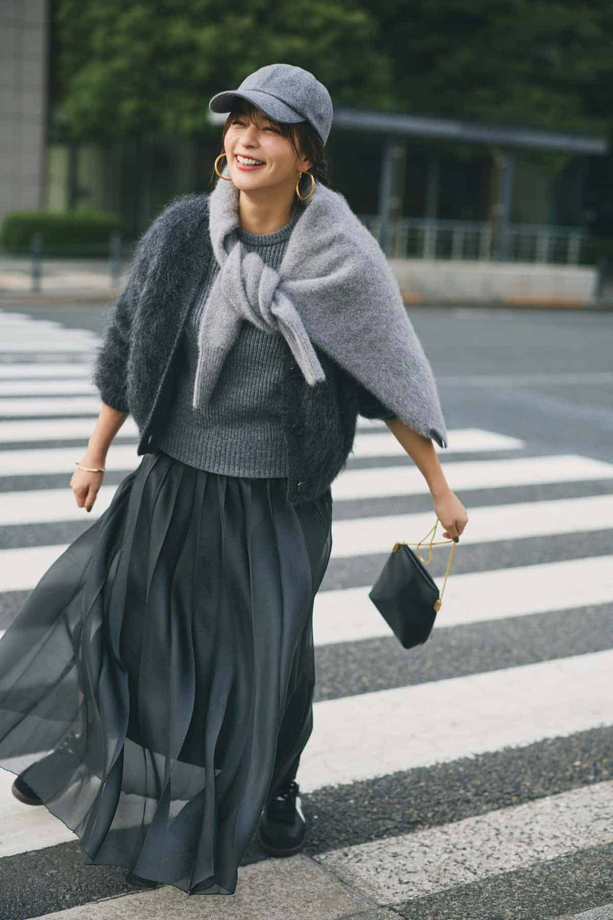 スカート¥49,500(サードマガジン)カーディガン¥53,900(サクラ/インターリブ)ニット¥35,200(オブリオ)肩がけしたニット¥37,400(アルページュストーリー/アルページュストーリー プレスルーム)バッグ¥69,300(マエストソ/オブリオ)スニーカー¥15,950(アスファルト/アースマーケティング)キャップ¥4,499(デッサン/ワールド プレスインフォメーション)ピアス¥17,600(アビステ)バングル¥6,330(エイチアッシュ/フォーティーン ショールーム)