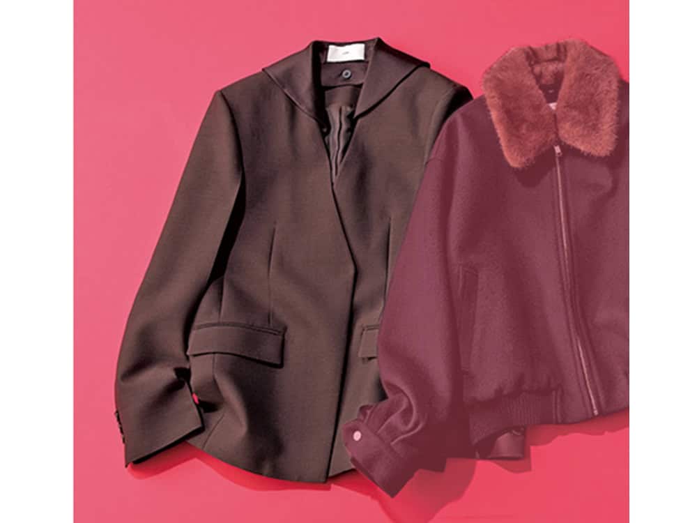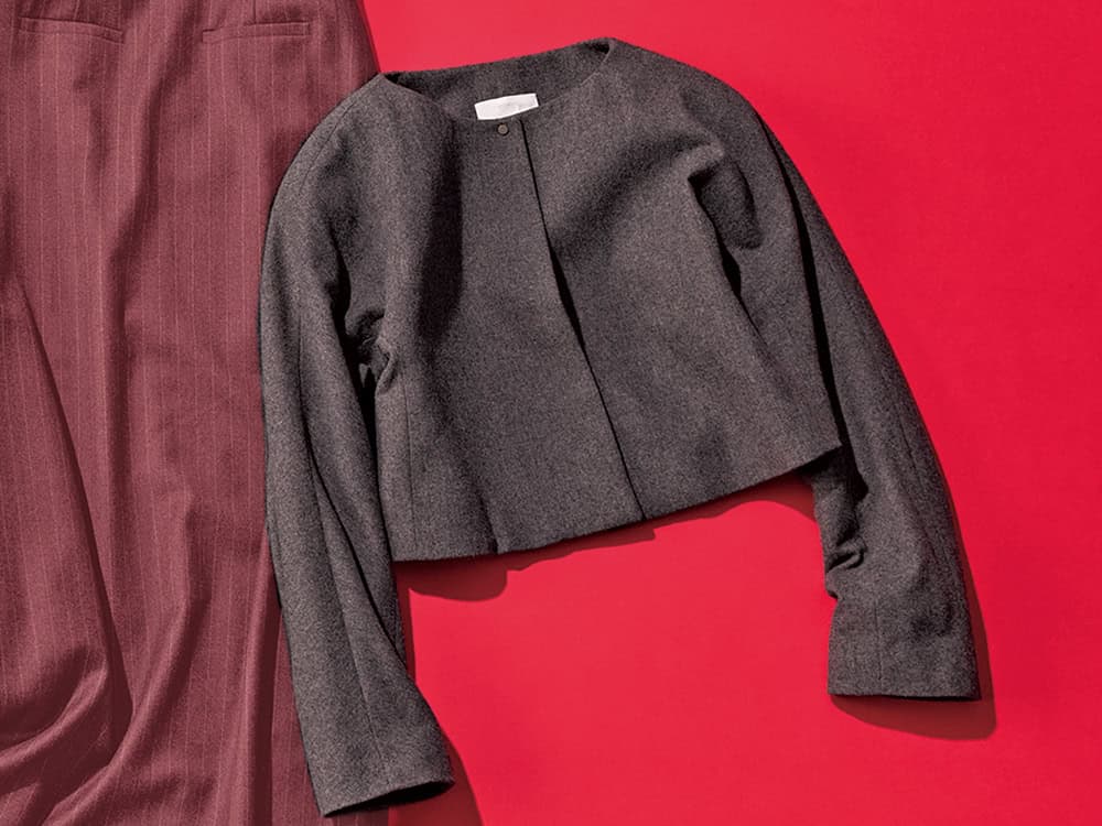 肩のラインをなぞるようにカーブを描く洗練フォルム。ジャケット¥56,100