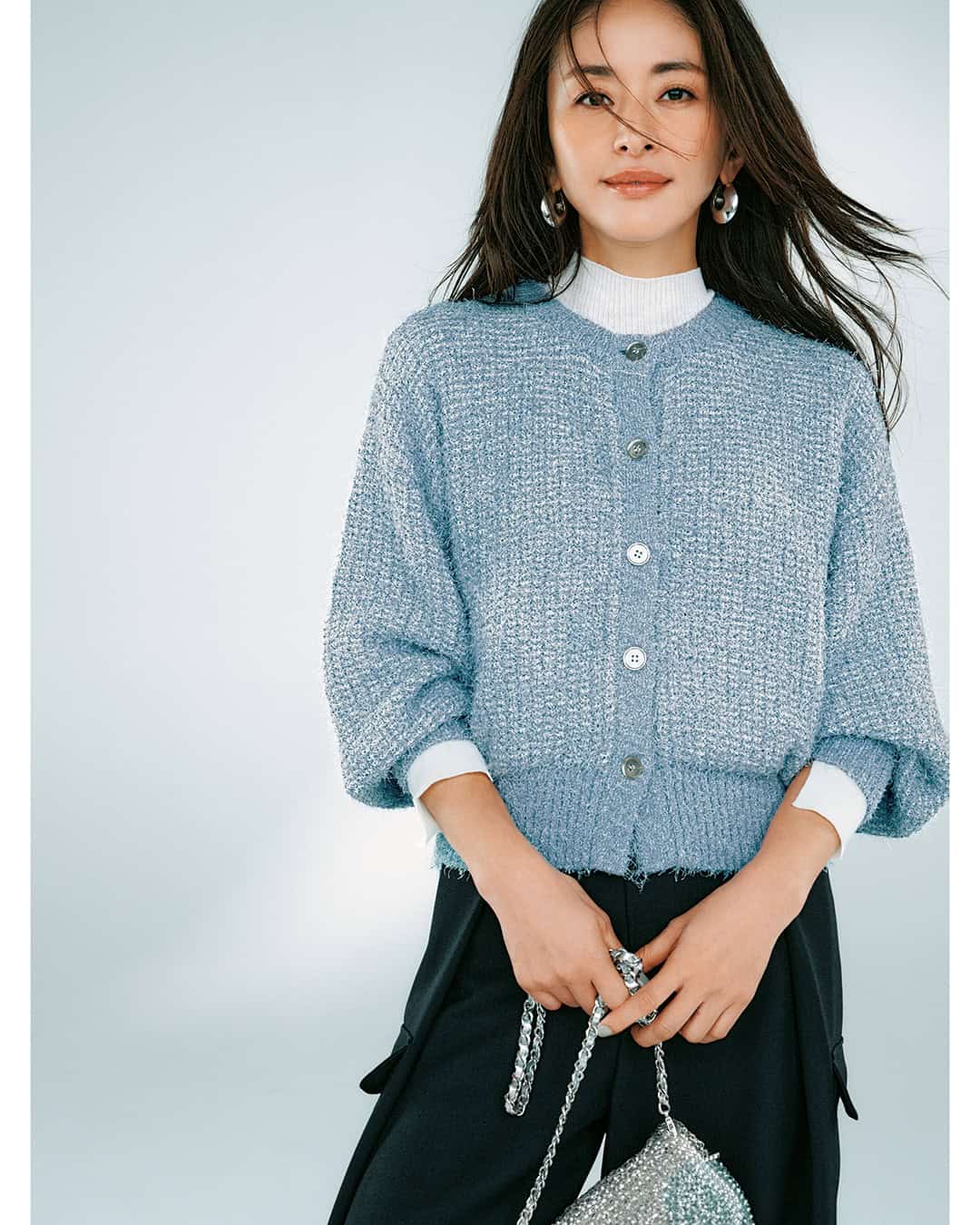 ③ラメ入りできれいめに着こなせる「ミックスニットカーデ」