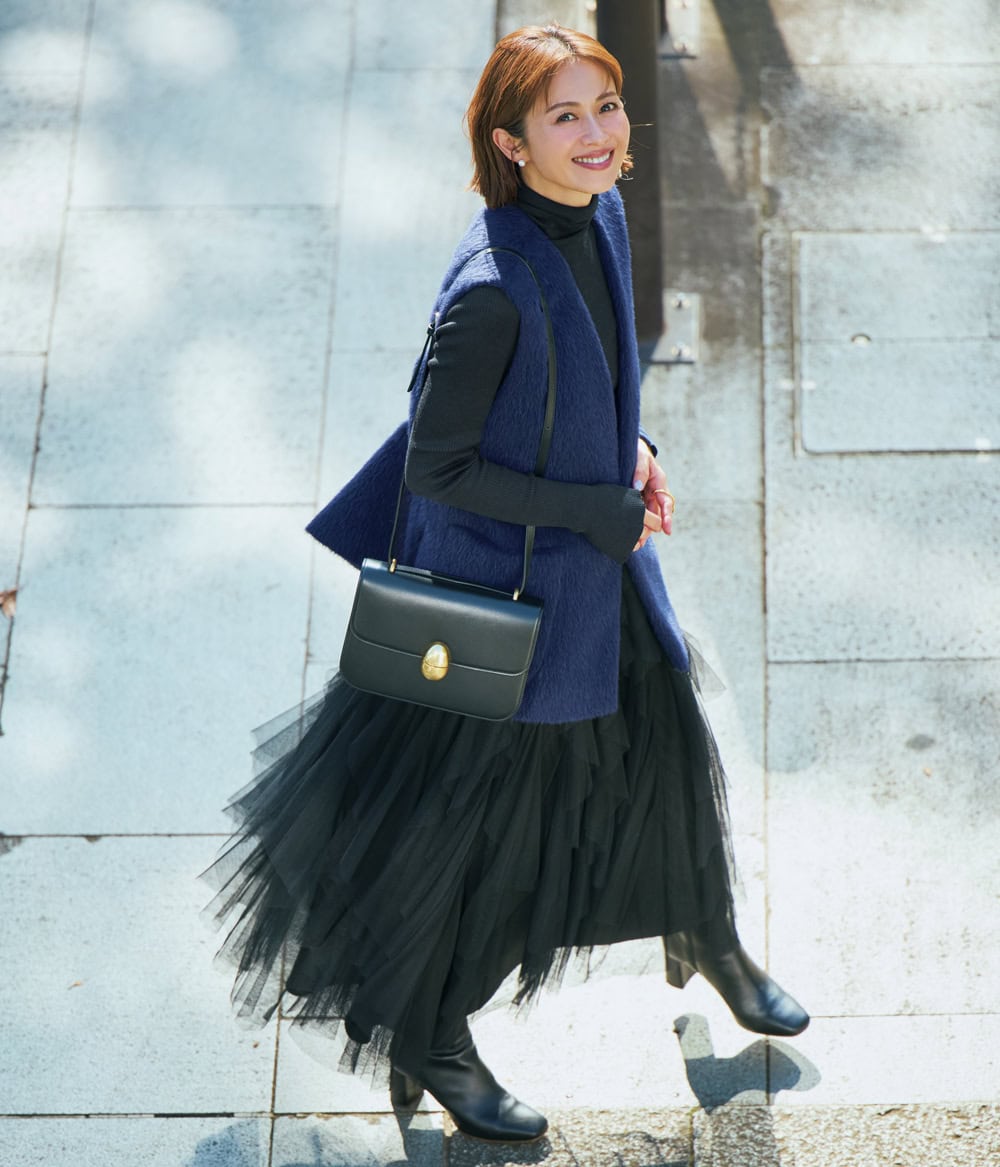 ほぼ黒コーデの合わせとして知的な信頼感を足せるネイビーに再注目!毛足長めで上品なツヤ感のあるジレが華やかさMAXのチュールスカートに大人の品格をもたらして地に足の着いたコーデに。ほんのり華やげるネイビーアイテムを足すことで、黒づくめ感も地味見えも払拭。