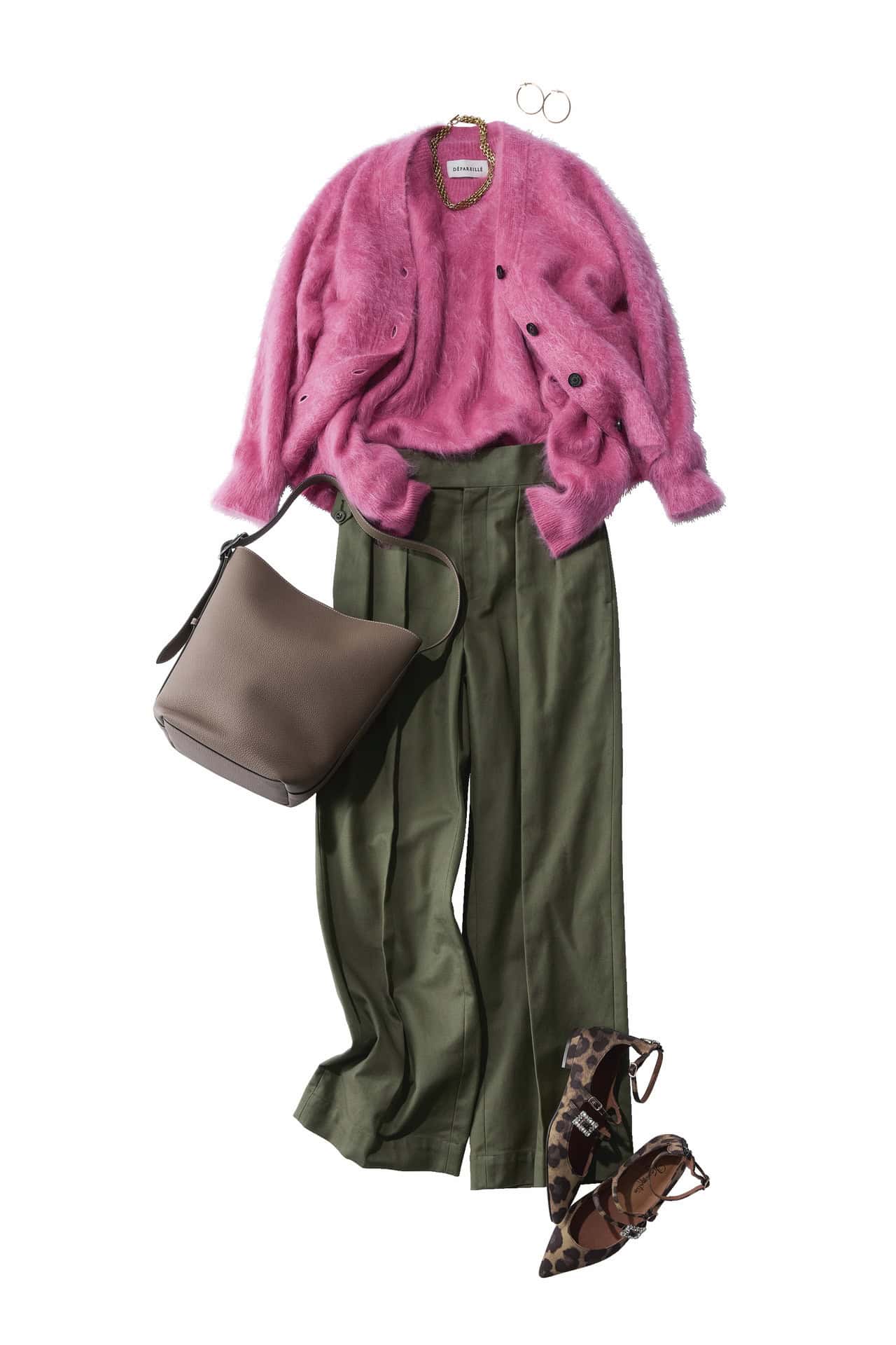 ふんわりとしたシャギー素材が、コーデに優しい華やぎを添えるピンクニット。セットアップのシャギーカーデを重ねれば、気温に合わせた調節も簡単。カーキのワイドパンツと合わせて、甘さを引き算した大人バランスが叶います。季節の変わり目こそ映える、洗練されたトレンド感が魅力です。