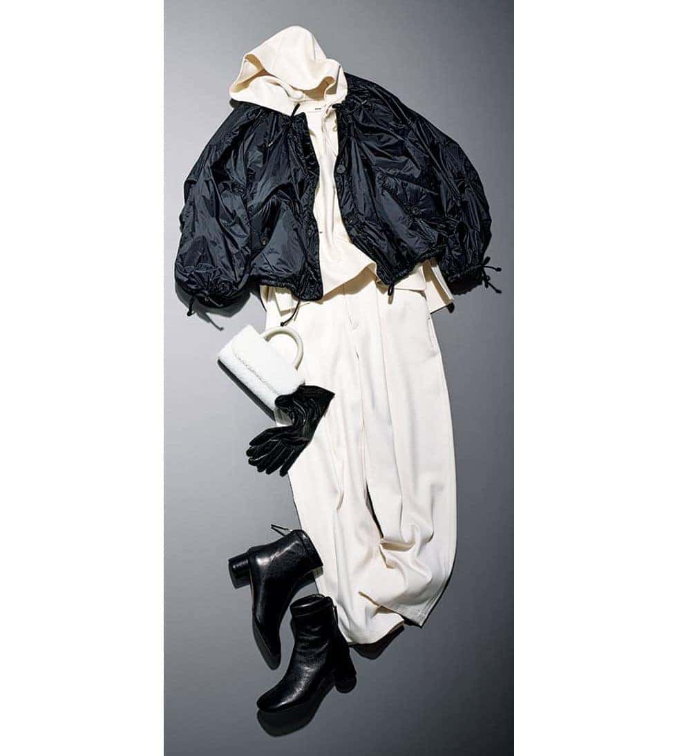 コート¥146,500(MARFA STANCE×Edition/エディション 表参道ヒルズ店)フードトップス¥94,600(エブール/リトルリーグ インク)パンツ¥36,300(ロエフ/エイチ ビューティー&ユース) バッグ¥84,700(サルチェ/フラッパーズ)ブーツ¥99,000〈ペリーコ〉グローブ¥23,100〈アルポ〉(ともにアマン)
