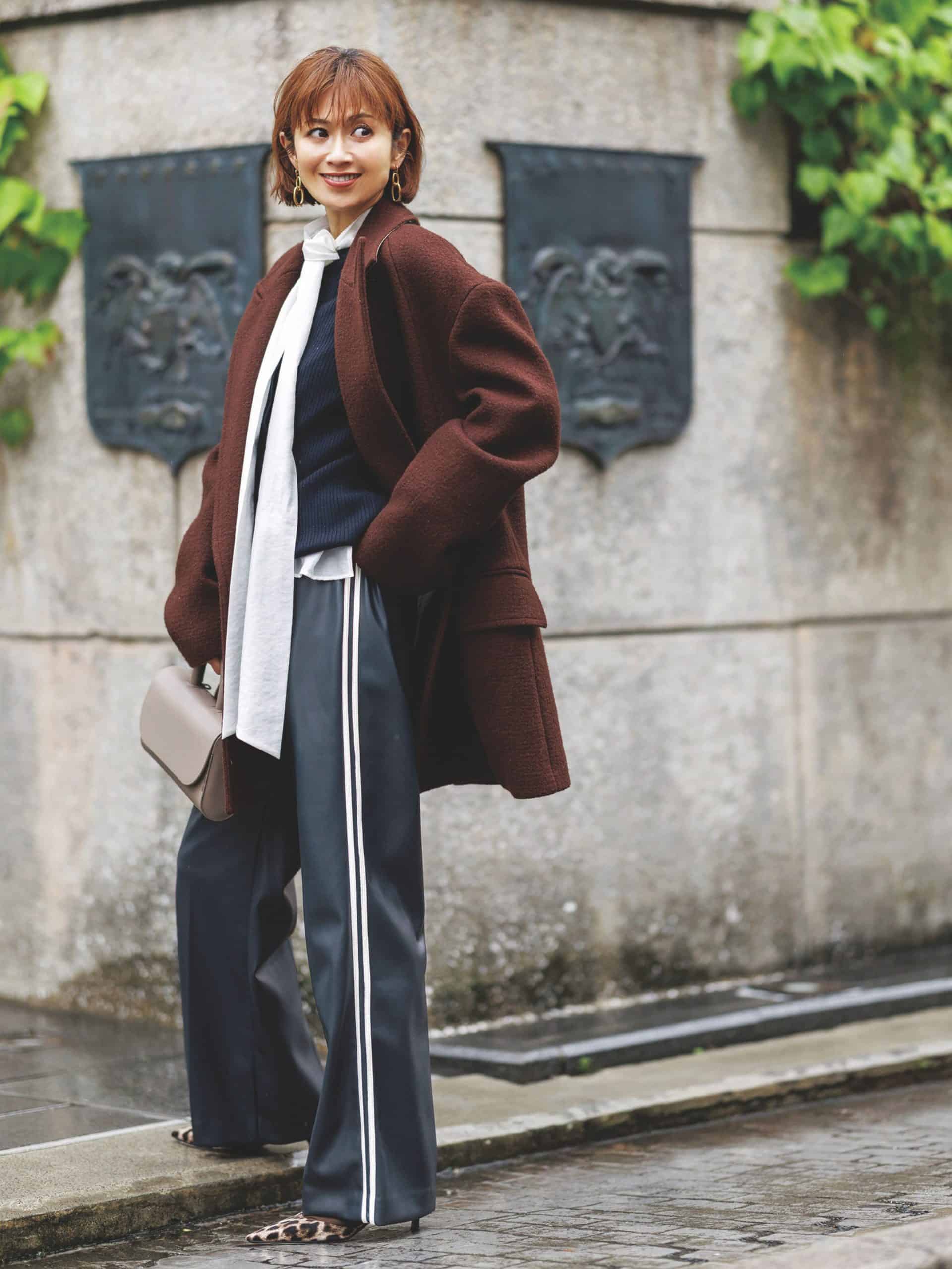 パンツ¥49,500(サードマガジン)コート¥154,000(エストネーション)ニット¥25,300(HER.)中に着たボウタイブラウス¥39,600(エブール/リトルリーグ)バッグ¥85,800(サルチェ/フラッパーズ)パンプス¥33,000(ハァウ/ウィム ガゼット 玉川髙島屋S・C店)ピアス¥8,800(ワンエーアールバイウノアエレ/ウノアエレ ジャパン)