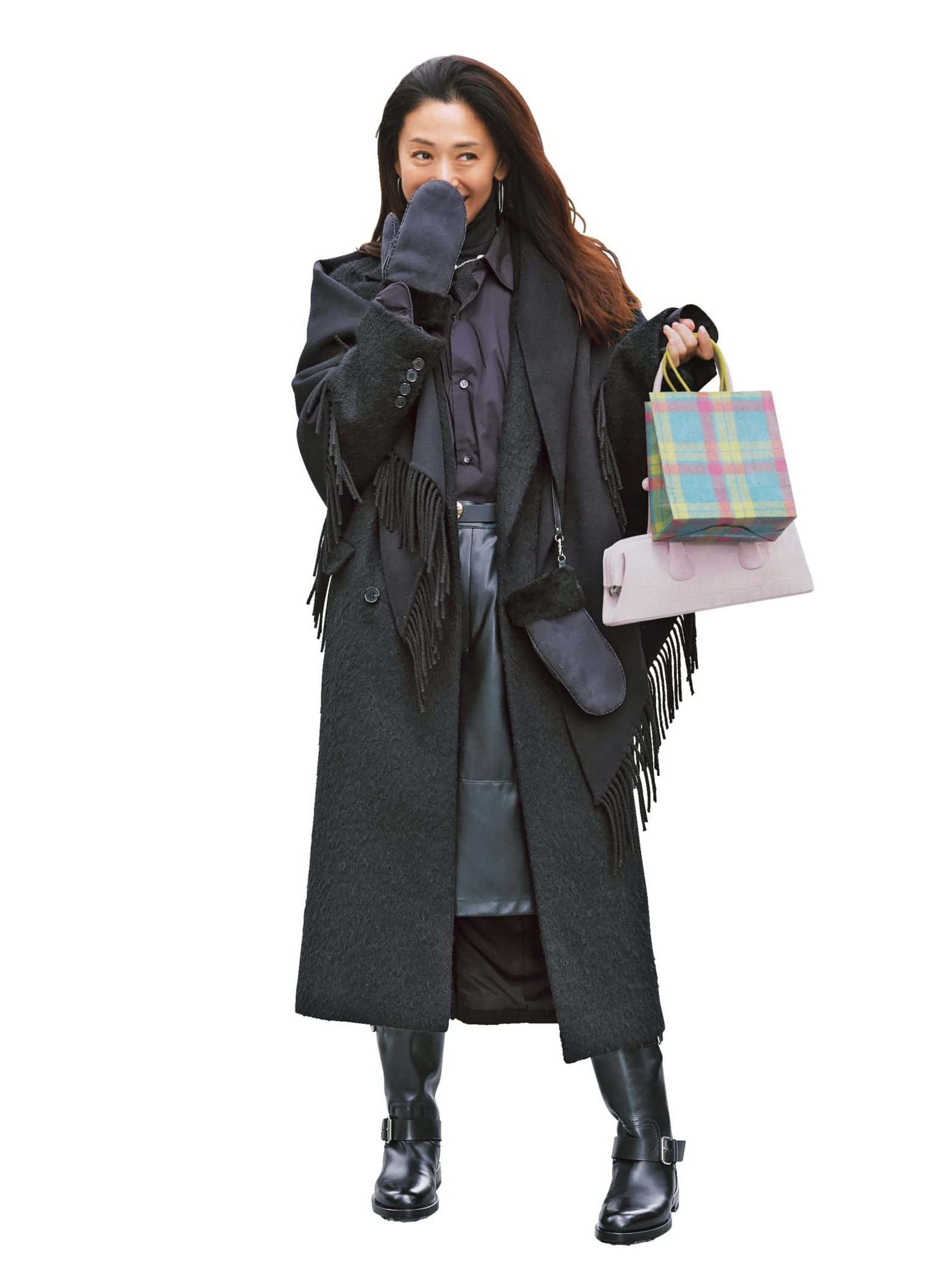 ロングコート¥114,400(エイチ ビューティー&ユース/エイチ ビューティー&ユース)ネイビーシャツ¥33,000(スローン/ザ ショップ スローン 新静岡セノバ店)グレータートルニット¥24,200〈ウィム ガゼット〉フリンジストール¥58,300〈AKS〉(ともにウィム ガゼット 玉川髙島屋S・C店)レザーハーフパンツ¥52,800(サヴィル サヴィ)ハートベルト¥13,200(レフィエ/フラッパーズ)グローブ¥37,400(アルポ/アマン)バッグ¥66,000(オソイ フォー ユナイテッドアローズ/CITEN ユナイテッドアローズ ルミネ池袋店)ブーツ¥289,300(ピエール アルディ/ピエール アルディ 東京)ピアス¥42,{hlb}900(マリハ)ネックレス¥29,700(プラウ)タイツ/スタイリスト私物