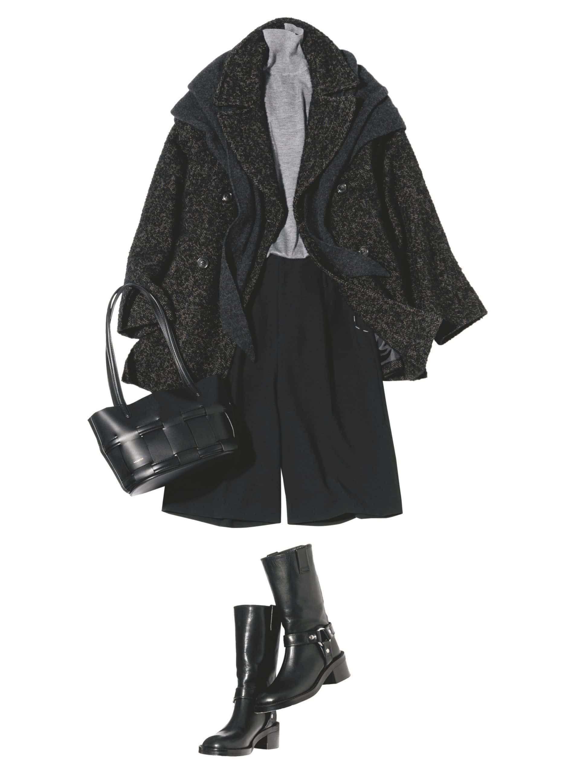 ストール¥37,400(アソース メレ/アイネックス)コート¥64,900(ティッカ)ニット¥66,000(エストネーション ザ ファースト/エストネーション)ハーフパンツ¥17,930(メゾンスペシャル/メゾンスペシャル 青山店)バッグ¥53,900(オルセット/オルサ)ブーツ¥79,200(PIPPICHIC/ベイジュ)