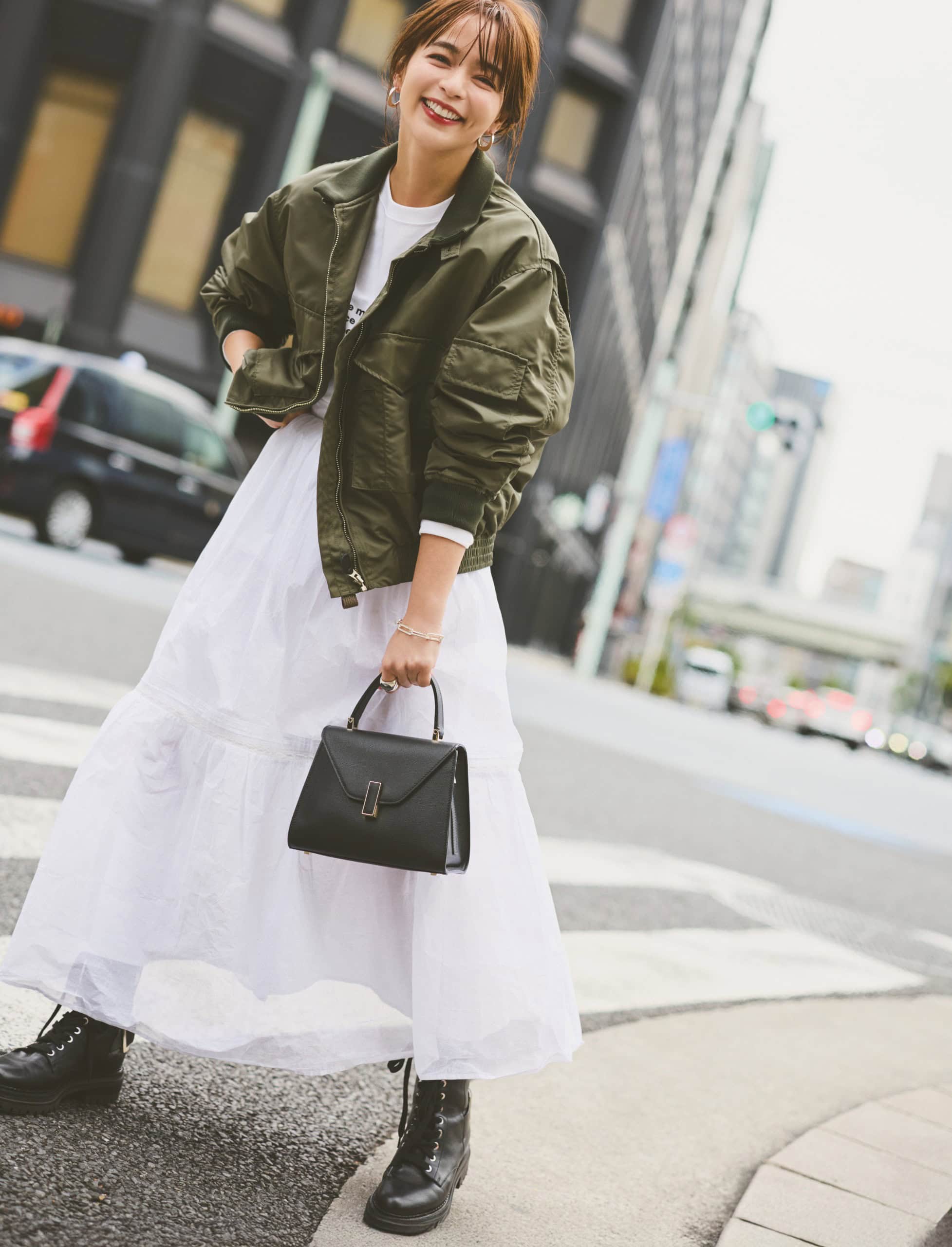 たっぷりのボリューム感が華やぐ白スカート。カーキのブルゾンを合わせて程よくラフに振り、甘さをデイリー仕様に。自然光に映えるパキッとした白が全体を明るく引き上げる、大人の甘辛カジュアルです。