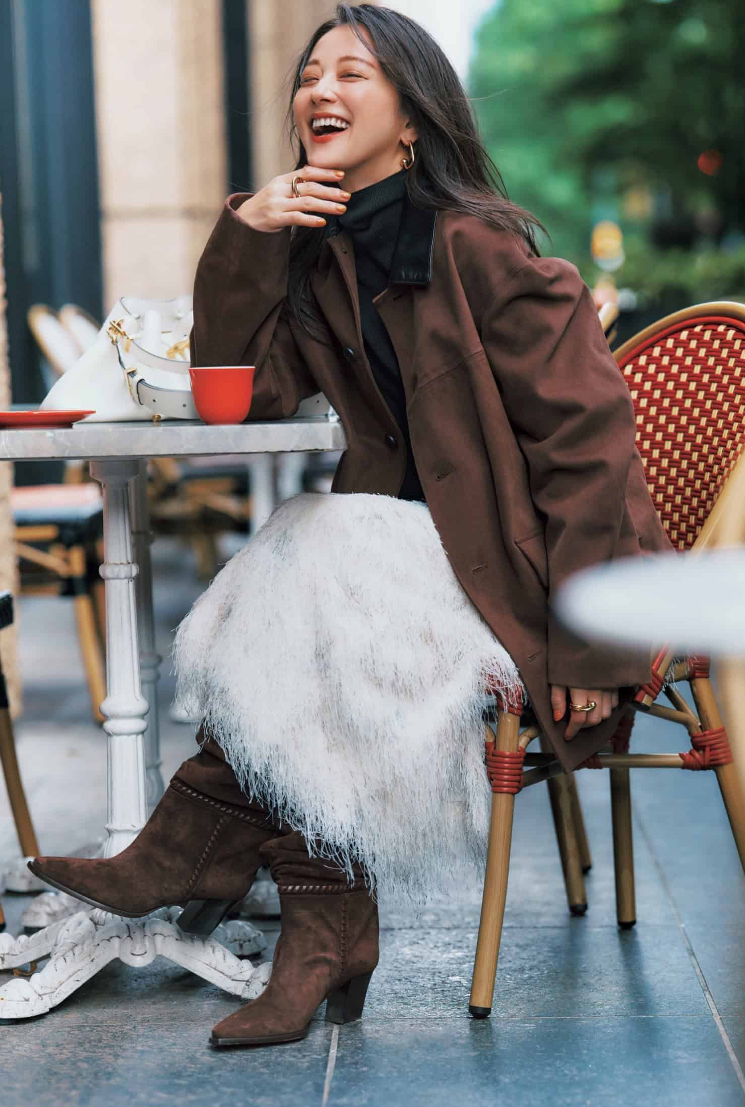 ふわっと華やかな白シャギースカートに、こっくりブラウンのメンズライクなブルゾンで甘さを中和。暗くなりがちな冬アウターコーデも、華やか素材×ハンサムJKで一気に軽やかに。甘ニッシュを今っぽく更新できる、旬バランスです。