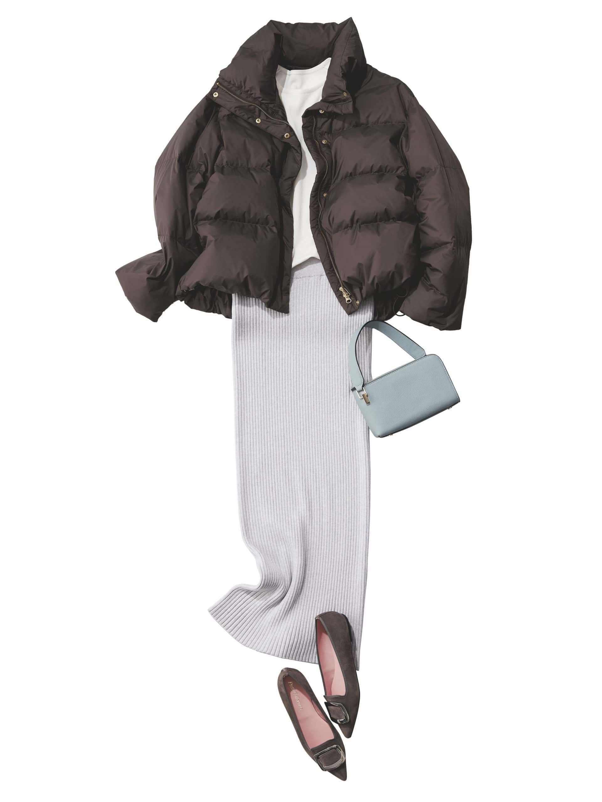 ブラウンダウンジャケット[撥水]¥26,990(TAION×UNFILO/アンフィーロ)トップス¥17,600(スタニングルアー/スタニングルアー 新宿店)リブニットタイトスカート¥27,500(LE PHIL/LE PHIL NEWoMan 新宿店)バッグ¥42,900(PUNTI./エルディスト ショールーム)パンプス¥40,700(プリティ・バレリーナ/F.E.N.)