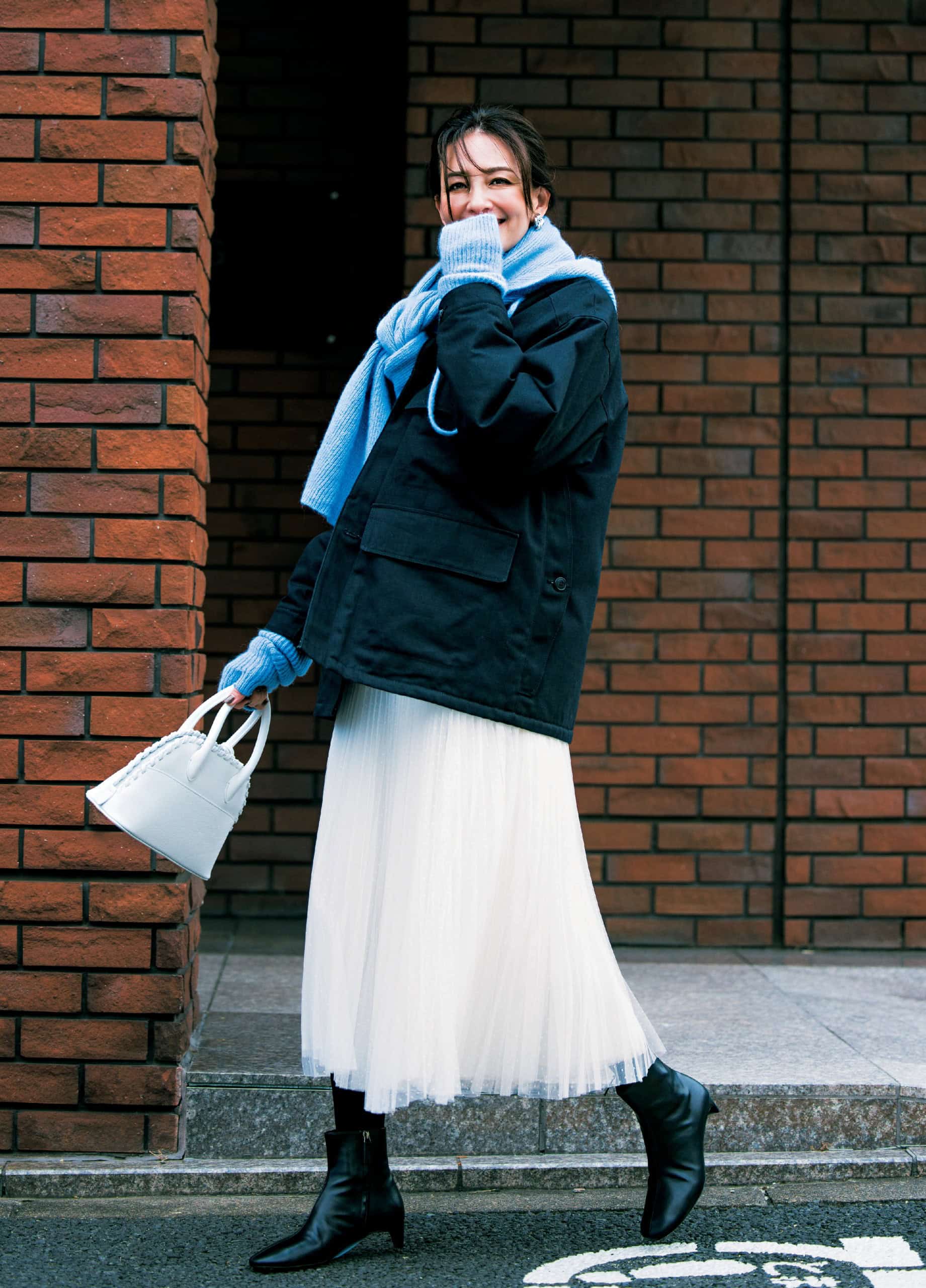 防寒性も洒落感も叶えるミリタリージャケットは、大人の甘辛MIXに欠かせない存在。白プリーツスカートを合わせれば自然な女性らしさが漂います。冬小物に淡いブルーを効かせて、さりげなく華やぎをプラス。機能性も見た目も妥協しない、冬終盤に頼れる一着です。