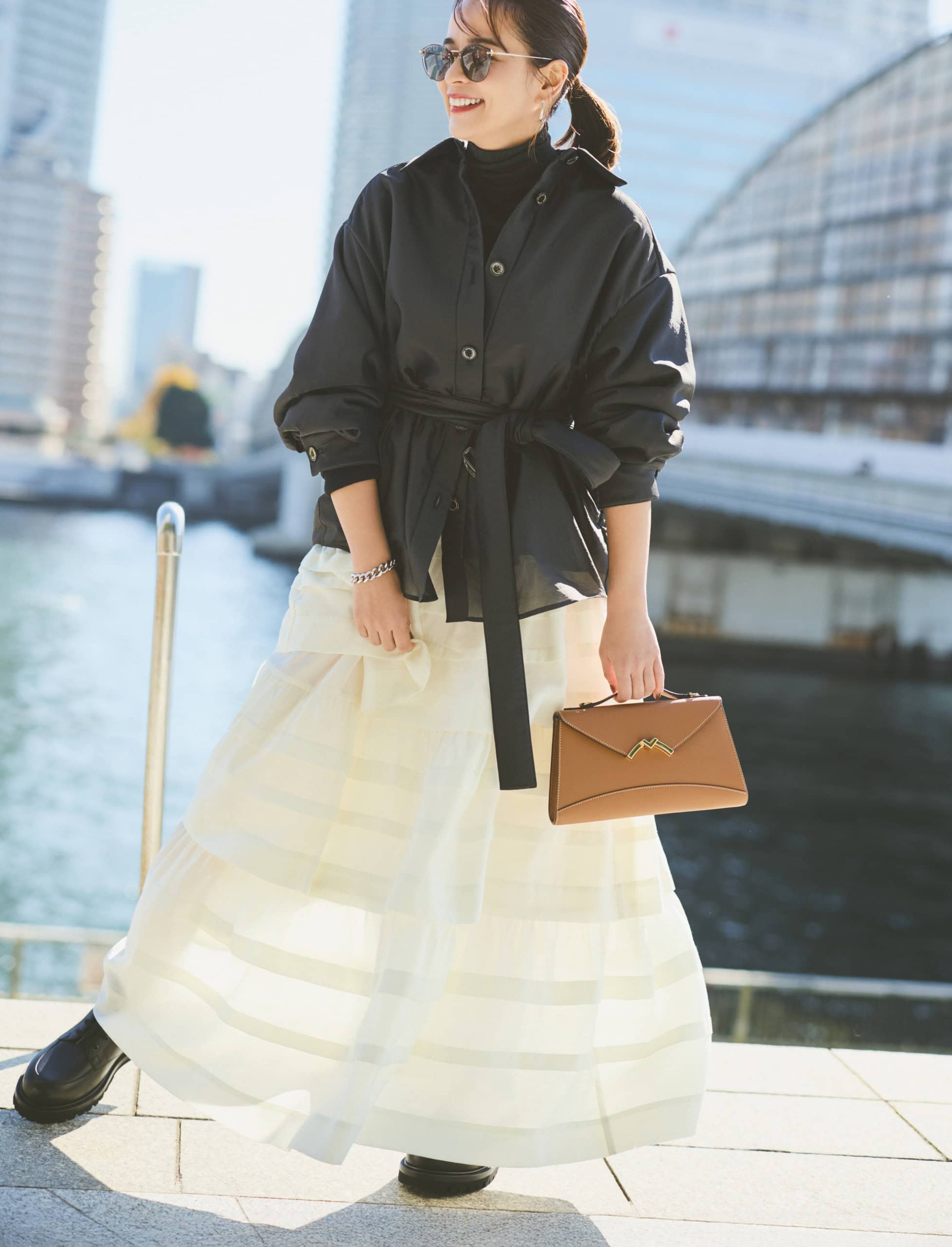 スカート¥53,900シャツジャケット¥64,900(ともにSov./フィルム)ニット¥11,000(ノーク)バッグ¥566,500(モワナ/モワナ 伊勢丹新宿店)ブーツ¥159,500※予定価格(ジェイエムウエストン/ジェイエムウエストン 青山店)サングラス¥50,600(アイヴァン/アイヴァン 東京ギャラリー)ピアス¥28,600(ブランイリス/ブランイリス トーキョー)ブレスレット¥95,700(ビジュードエム/ビジュードエム六本木ヒルズ)